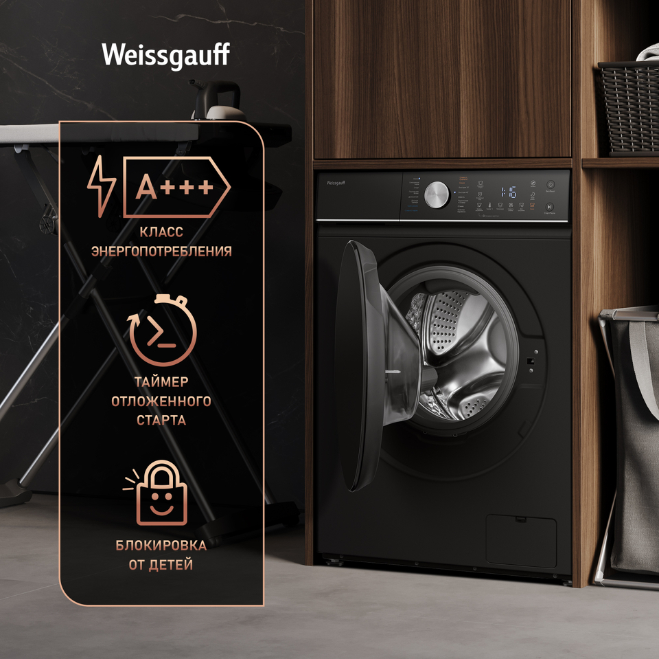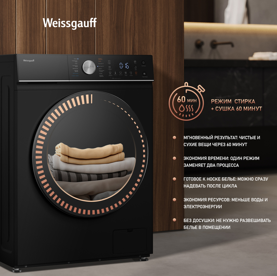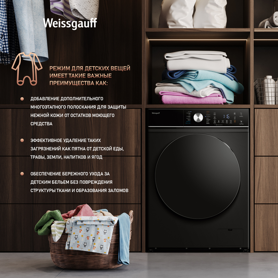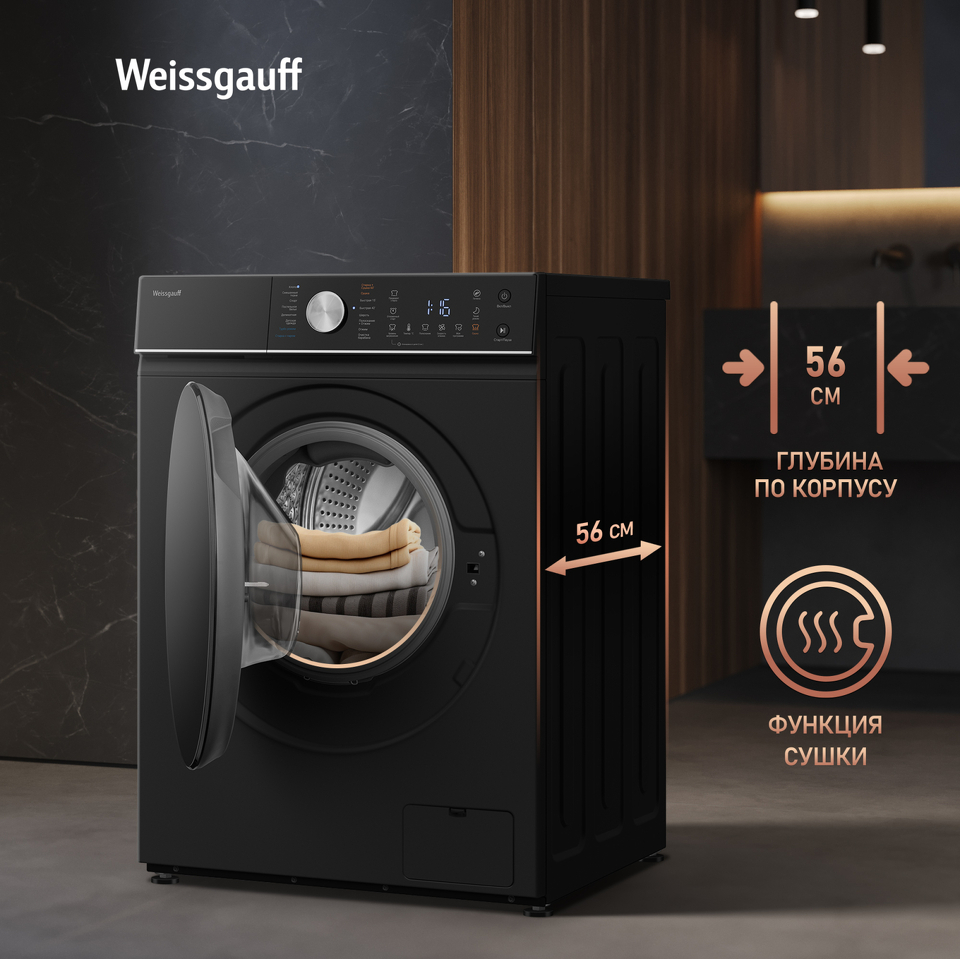 Отдельностоящая стиральная машина с сушкой, обработкой паром, оснащенная инверторным двигателем, имеет впечатляющий показатель загрузки до 11 кг белья при стирке и 7 кг при сушке, а также впечатляющую скорость отжима до 1200 оборотов в минуту - что делает эту модель одной из наиболее передовых в линейке стиральных машин Weissgauff.