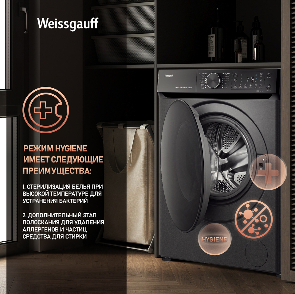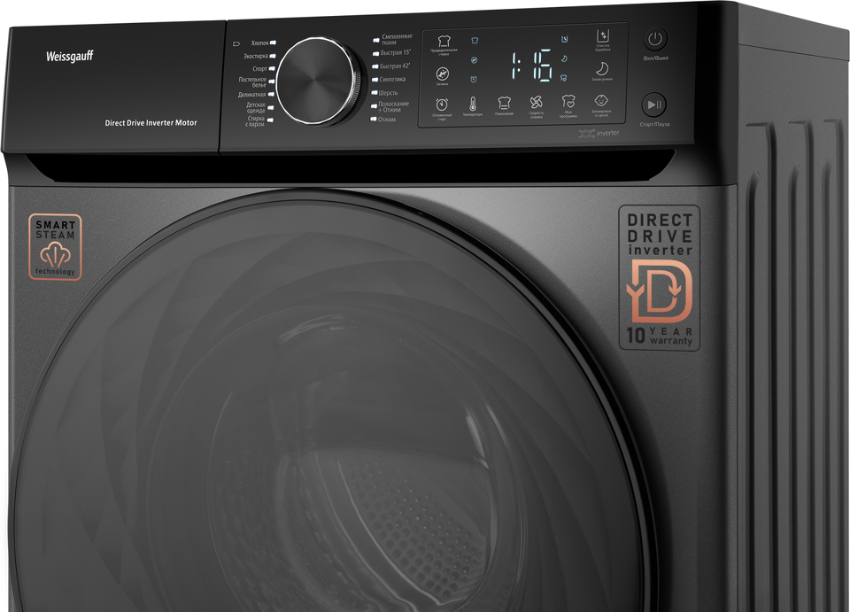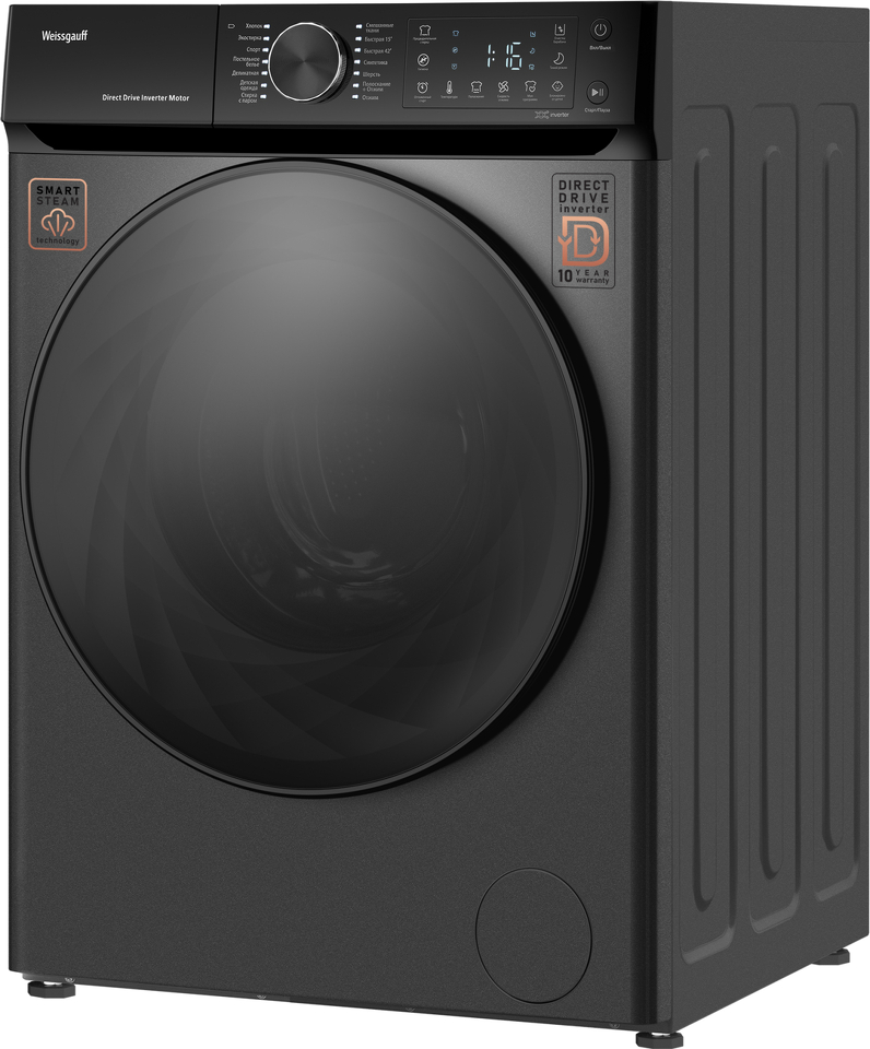 Отдельностоящая стиральная машина Weissgauff выполненная в тёмно-сером цвете, оснащенная прямым приводом, инверторным двигателем работающим по особой технологии BLDC и функцией пара, имеющая показатели загрузки до 11 кг белья и скорости отжима до 1400 оборотов в минуту - это настоящее качество по разумной цене!