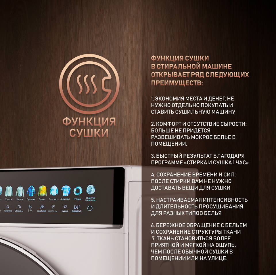 Режим "Сушка" позволит запустить цикл просушивания белья, благодаря чему эта стиральная машина поможет вам получить не только чистые и постиранные вещи, но также и высушить их для того, чтобы убрать в шкаф или сразу надеть на себя!