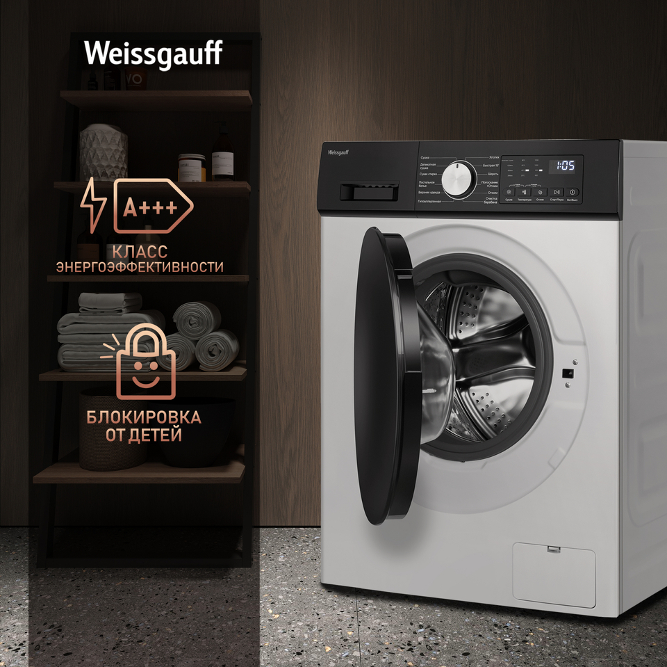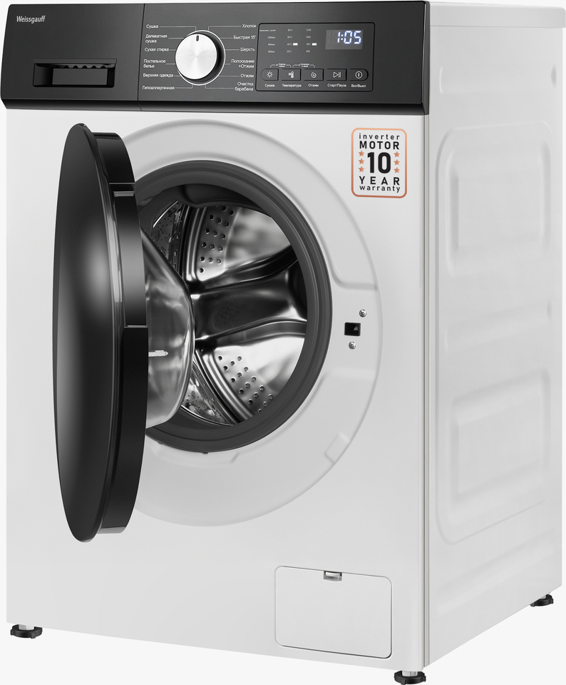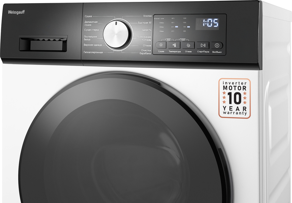Отдельностоящая стиральная машина с функцией сушки Weissgauf, оснащенная инверторным двигателем, работающим по особой технологии BLDC, имеет фантастический показатель загрузки до 10,5 килограммов белья и невероятную скорость отжима до 1200 оборотов в минуту - это гарантия непревзойденной эффективности и высокого результата при каждой стирке вашего белья.