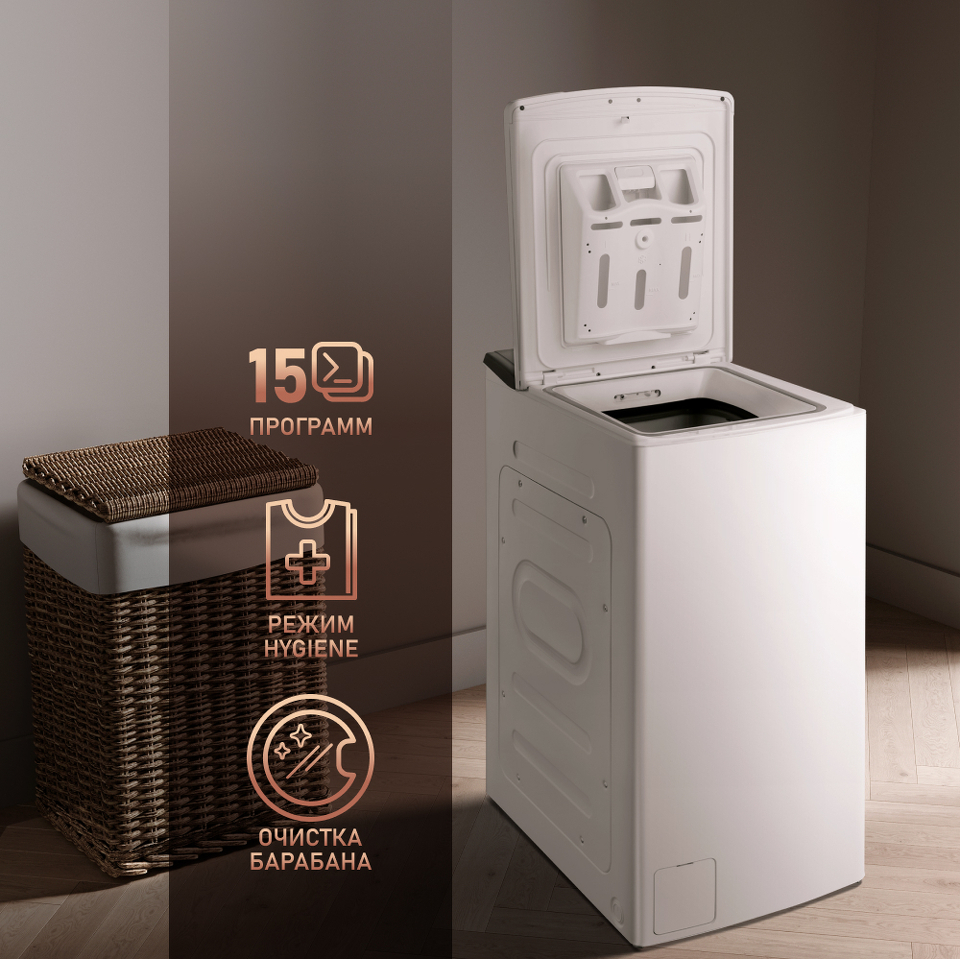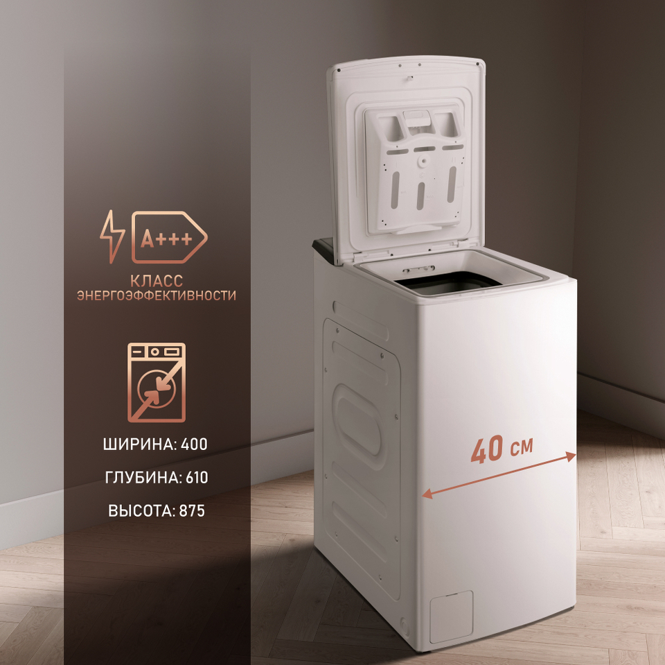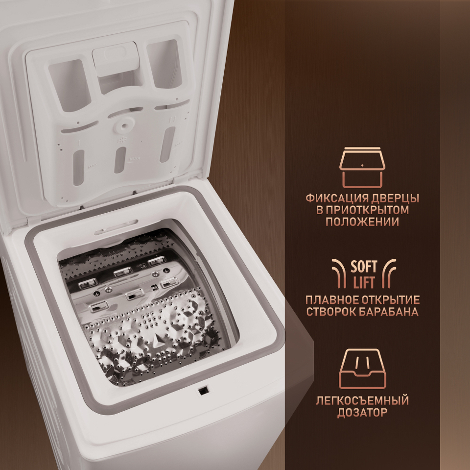 Вертикальная загрузка - открывает целый ряд эргономических преимуществ, связанных с возможностью установки данной модели даже в самой малогабаритной квартире!