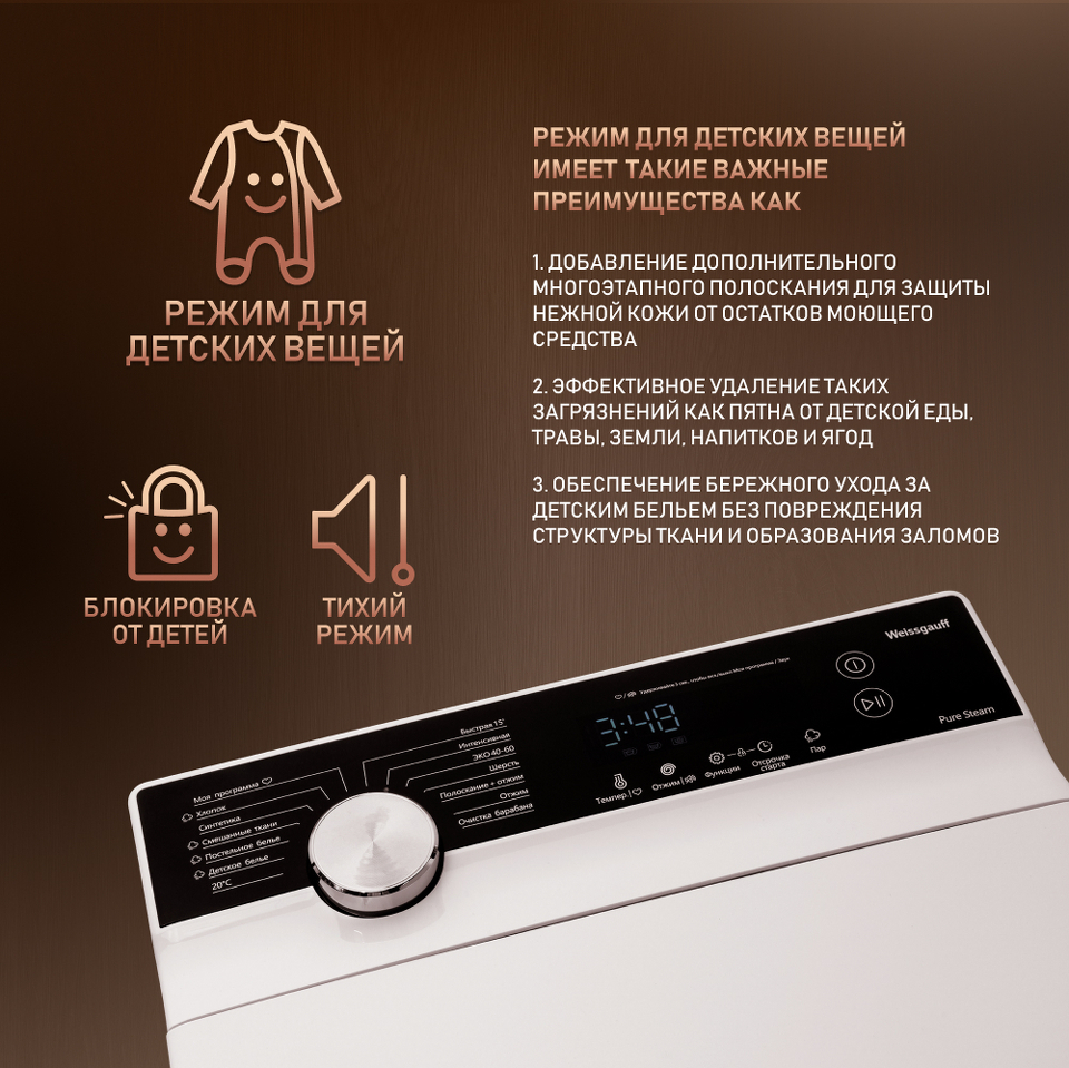 Режим для детских вещей добавляет дополнительное полоскание, что особо важно при защите нежной кожи от остатков моющего средства.