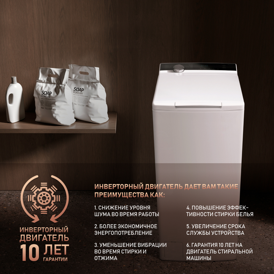 Инверторный двигатель, построенный по особой технологии, использующей электромагнитное поле для вращения барабана (без применения щёток), что значительно снижает уровень шума, износа и энергопотребления.