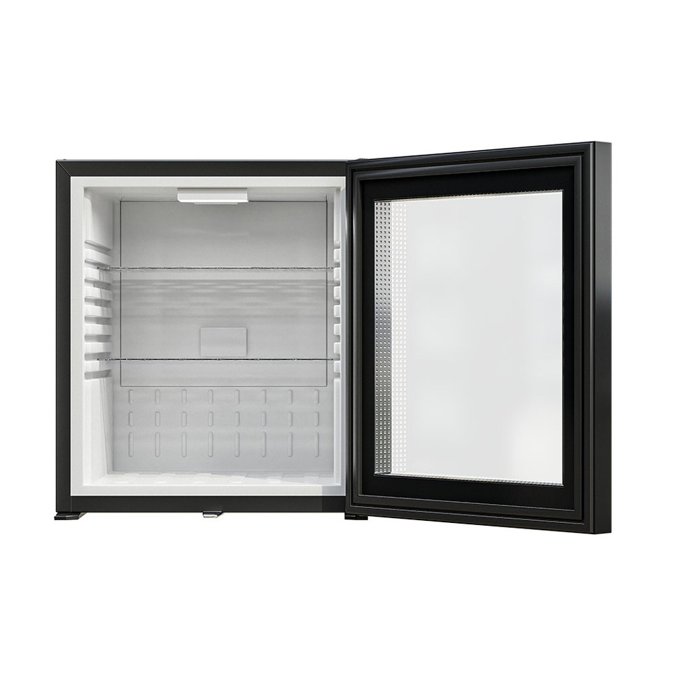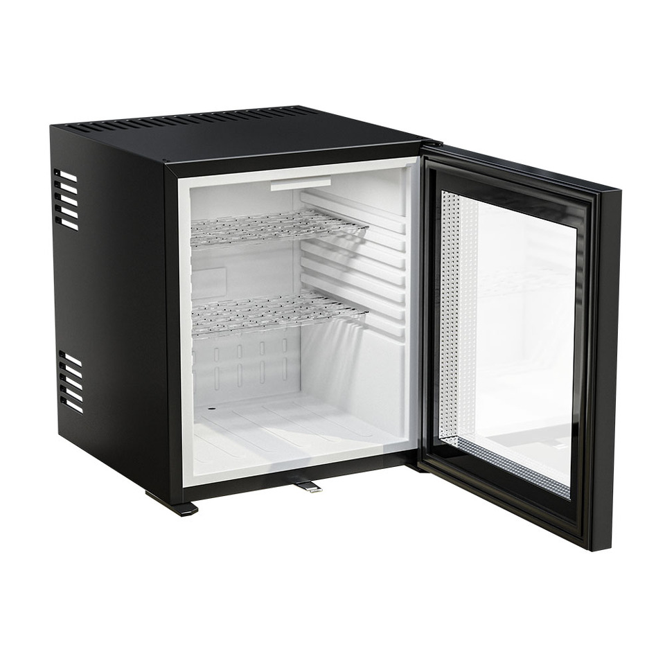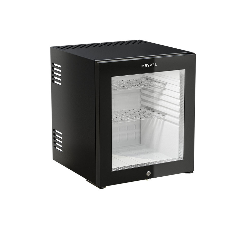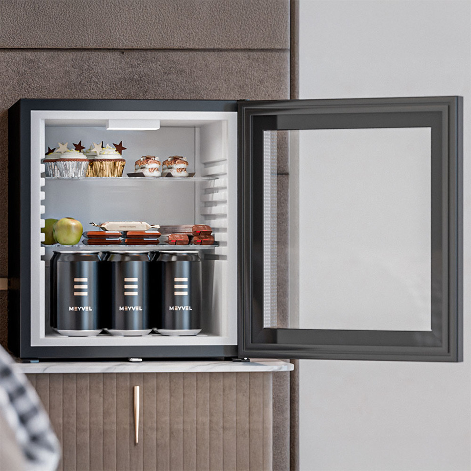 Дверца Meyvel MMT-30BG реверсивная, поэтому устройство адаптируется к конкретным условиям установки, и стеклянная, чтобы видеть содержимое без необходимости открывать мини-бар. Это удобно для гостей отеля или сотрудников офиса.