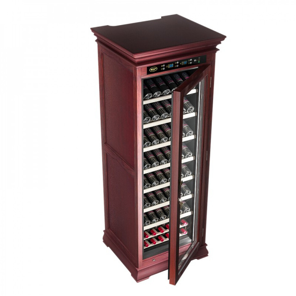 Классический винный шкаф C108-WM1 (Classic) является стильным дополнением к вашему дому и прекрасным помощником в вопросе хранения вина. Объем данного шкафа составляет 300 литров, а это означает, что вы с легкостью можете разместить внутри него до 108 бутылок вина типа Бордо объемом по 0, 75 литра. Данная модель является отдельностоящей, а это означает что у вас появится не просто многофункциональный помощник, но также и стильное дополнение к вашему интерьеру. Данный винный шкаф не подразумевает разделения на зоны, соответственно, вы можете разместить в нем вина только одного типа. Температурный режим может быть выставлен любой в диапазоне от +5 до +22 ˚С. Уникальная опция линейки данных шкафов - наличие цифрового контроля влажности. Тип охлаждения - компрессорный. Корпус данного винного шкафа классический из дерева цвета махагон (американский дуб). В базовой комплектации имеются деревянные выкатные полки в количестве 8 штук.