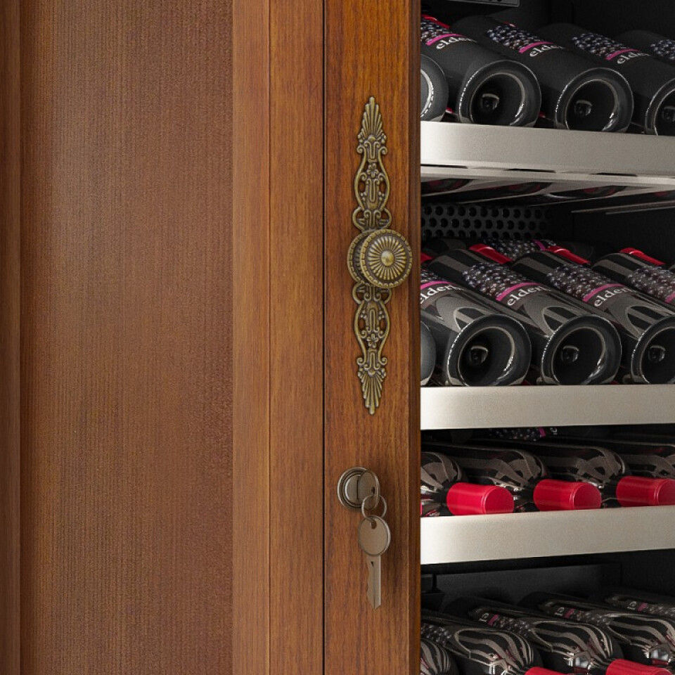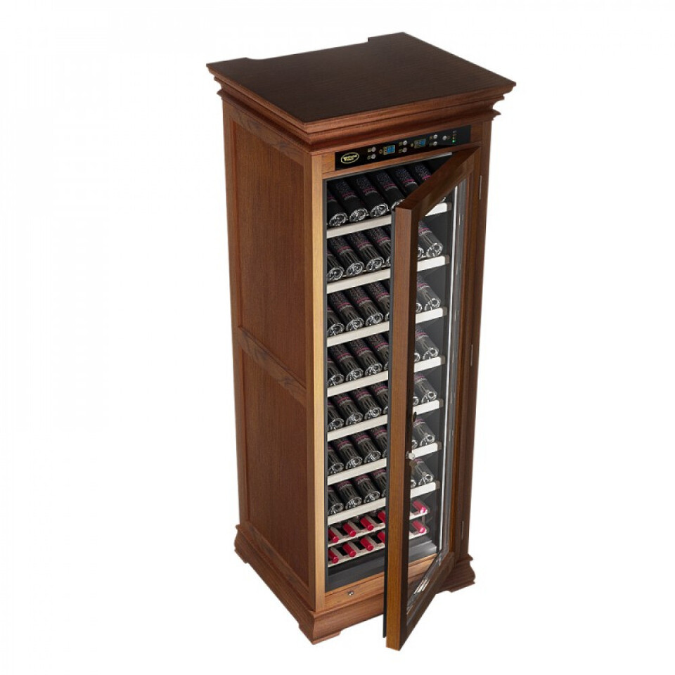 Классический винный шкаф C108-WN1 (Classic) является стильным дополнением к вашему дому и прекрасным помощником в вопросе хранения вина. Объем данного шкафа составляет 300 литров, а это означает, что вы с легкостью можете разместить внутри него до 108 бутылок вина типа Бордо объемом по 0, 75 литра. Данная модель является отдельностоящей, а это означает что у вас появится не просто многофункциональный помощник, но также и стильное дополнение к вашему интерьеру. Данный винный шкаф не подразумевает разделения на зоны, соответственно, вы можете разместить в нем вина только одного типа. Температурный режим может быть выставлен любой в диапазоне от +5 до +22 ˚С. Уникальная опция линейки данных шкафов - наличие цифрового контроля влажности. Тип охлаждения - компрессорный. Корпус данного винного шкафа классический из натурального дерева цвета орех (американский дуб). В базовой комплектации имеются деревянные выкатные полки в количестве 8 штук.