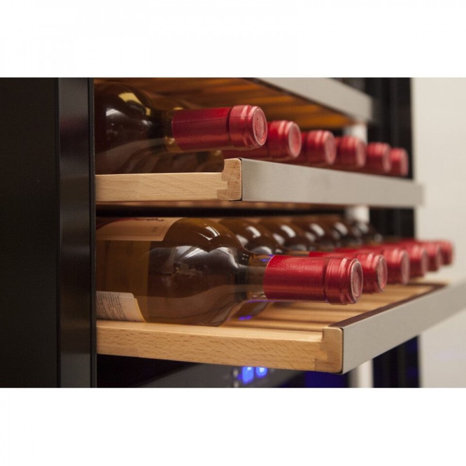 Регулируемый температурный режим каждой зоны шкафа в диапазоне от +5°C до +18°C позволяет хранить белые, красные и игристые вина.