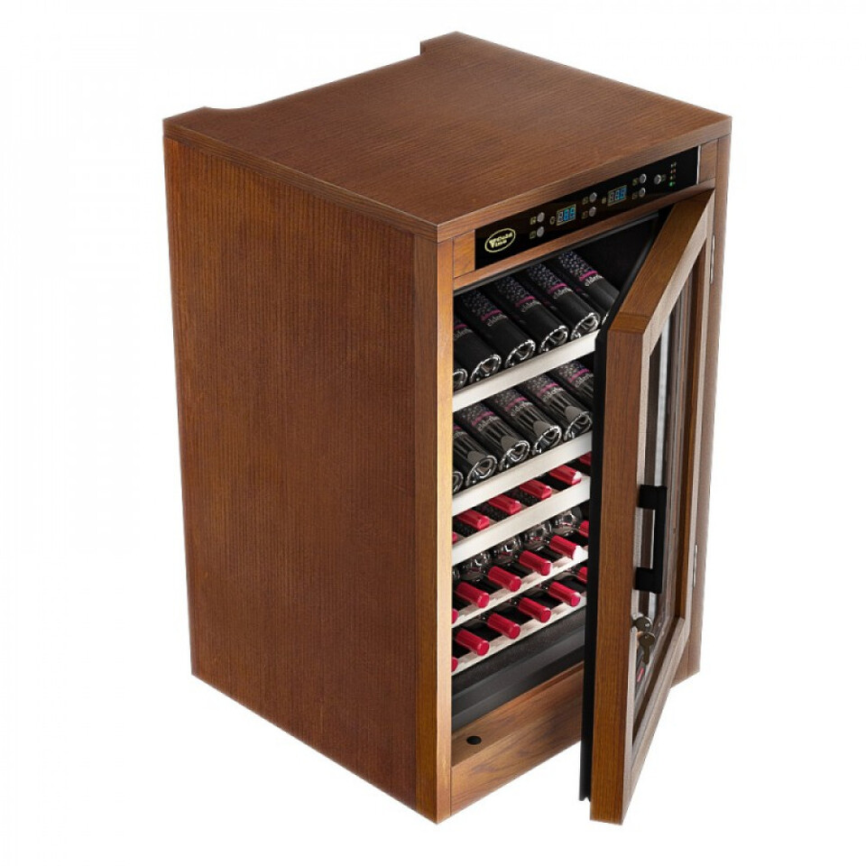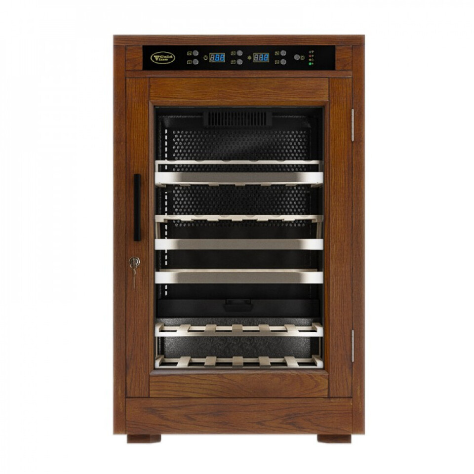 Классический винный шкаф Cold Vine C46-WN1 (Modern) является стильным дополнением к вашему дому и прекрасным помощником в вопросе хранения вина. Объем данного шкафа составляет 138 литров, а это означает, что вы с легкостью можете разместить внутри него до 46 бутылок вина типа Бордо объемом по 0, 75 литра. Данная модель является отдельностоящей, а это означает что у вас появится не просто многофункциональный помощник, но также и стильное дополнение к вашему интерьеру. Данный винный шкаф не подразумевает разделения на зоны, соответственно, вы можете разместить в нем вина только одного типа. Температурный режим может быть выставлен любой в диапазоне от +5 до +22 ˚С. Уникальная опция линейки данных шкафов - наличие цифрового контроля влажности. Тип охлаждения - компрессорный. Корпус данного винного шкафа классический черный и обит деревом цвета орех (шпон дуба). В базовой комплектации имеются деревянные выкатные полки в количестве 4 штук.