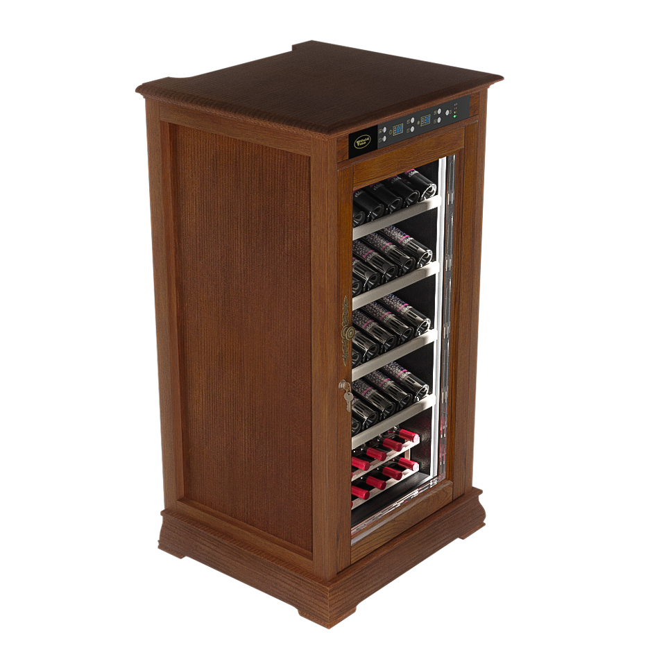 Классический винный шкаф Cold Vine C66-WM1 (Classic) является стильным дополнением к вашему дому и прекрасным помощником в вопросе хранения вина. Объем данного шкафа составляет 200 литров, а это означает, что вы с легкостью можете разместить внутри него до 66 бутылок вина типа Бордо объемом по 0, 75 литра. Данная модель является отдельностоящей, а это означает что у вас появится не просто многофункциональный помощник, но также и стильное дополнение к вашему интерьеру. Данный винный шкаф не подразумевает разделения на зоны, соответственно, вы можете разместить в нем вина только одного типа. Температурный режим может быть выставлен любой в диапазоне от +5 до +22 ˚С. Уникальная опция линейки данных шкафов - наличие цифрового контроля влажности. Тип охлаждения - компрессорный. Корпус данного винного шкафа выполнен из натурального дерева цвета орех (американский дуб). В базовой комплектации имеются деревянные выкатные полки в количестве 5 штук.