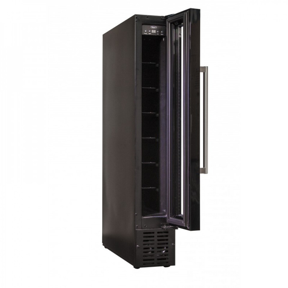 Компактный и элегантный винный шкаф Cold Vine C7-KBT1 на 7 бутылок вина с одной температурной зоной. Модель оснащена внутренним вентилятором для равномерного доступа холодного воздуха ко всем полкам шкафа и внешним вентилятором для быстрого эффективного охлаждения компрессора. Комплектуется холодильник C7-KBT1 шестью металлическими полками. В его верхней части находится электронная панель, с помощью которой пользователь выбирает необходимый температурный режим работы аппарата. На ней расположены кнопки для регулировки температуры и включения освещения.