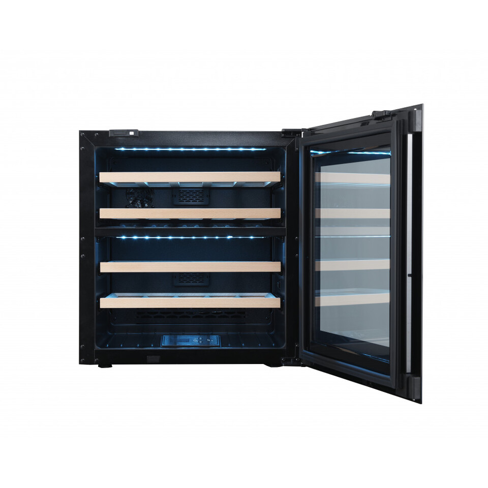 Эксклюзивный компрессорный винный шкаф с двумя зонами на 26 бутылок. Его элегантный внешний вид, полностью тонированное стекло, дверь с технологией Touch Open делают его презентабельным в современном кухонном гарнитуре без ручек. Дверь открывается нажатием на левый верхний угол. Бутылки размещаются на крепких деревянных полках в потрясающем голубом освещении. Винный шкаф DAB-26.69DB.TO оснащен сигнализатором открытой двери и функцией шаббат. Данная модель встраивается в кухонный гарнитур в соответствии с определенными параметрами: ниша для встраивания должна иметь размеры, которые позволят разместить внутри винный шкаф габаритами 598x590x565 (ВхШхГ, мм). Таким образом, высота ниши для встраивания может варьироваться от 598 мм до 600 мм, тогда как минимальные размеры ширины будут равны 590 мм, глубины - 565 мм. После установки данной модели в нишу , дверца располагается таким образом, что между гарнитуром и винным шкафом не остается никаких зазоров, потому как размеры дверцы чуть больше размера самой конструкции - высота 590 мм, ширина 592 мм.Обратите внимание на то, что это полностью встраиваемая модель наряду с кухонными шкафами и бытовой техникой, и не предназначена для использования как отдельно стоящий винный шкаф.