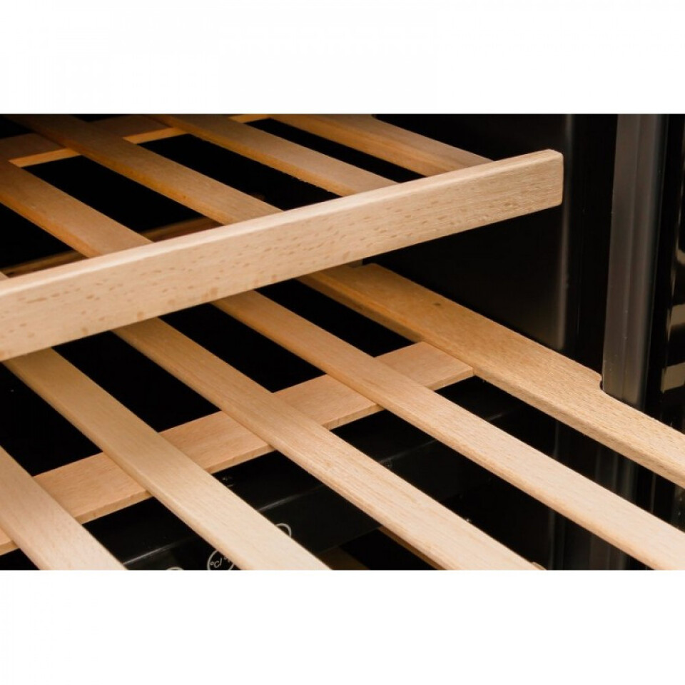 Винный шкаф DX-51.150DBK/DP из специальной серии винных холодильников для встройки под столешницу. Модель имеет две зоны охлаждения, максимальная разница температур между которыми не должна превышать 8°С. Шкаф оснащен новым, мощным компрессором, с пониженным энергопотреблением и шумом, внутренними вентиляторами в каждой зоне для равномерного доступа холодного воздуха ко всем полкам шкафа, угольным фильтром и нагревательным элементом. Комплектуется холодильник DX-51.150DBK/DP шестью деревянными полками и съемной вентиляционной решеткой. В нем предусмотрена возможность перевешивания двери на другую сторону, что дает дополнительное удобство при установке холодильника в подходящее по габаритам место.