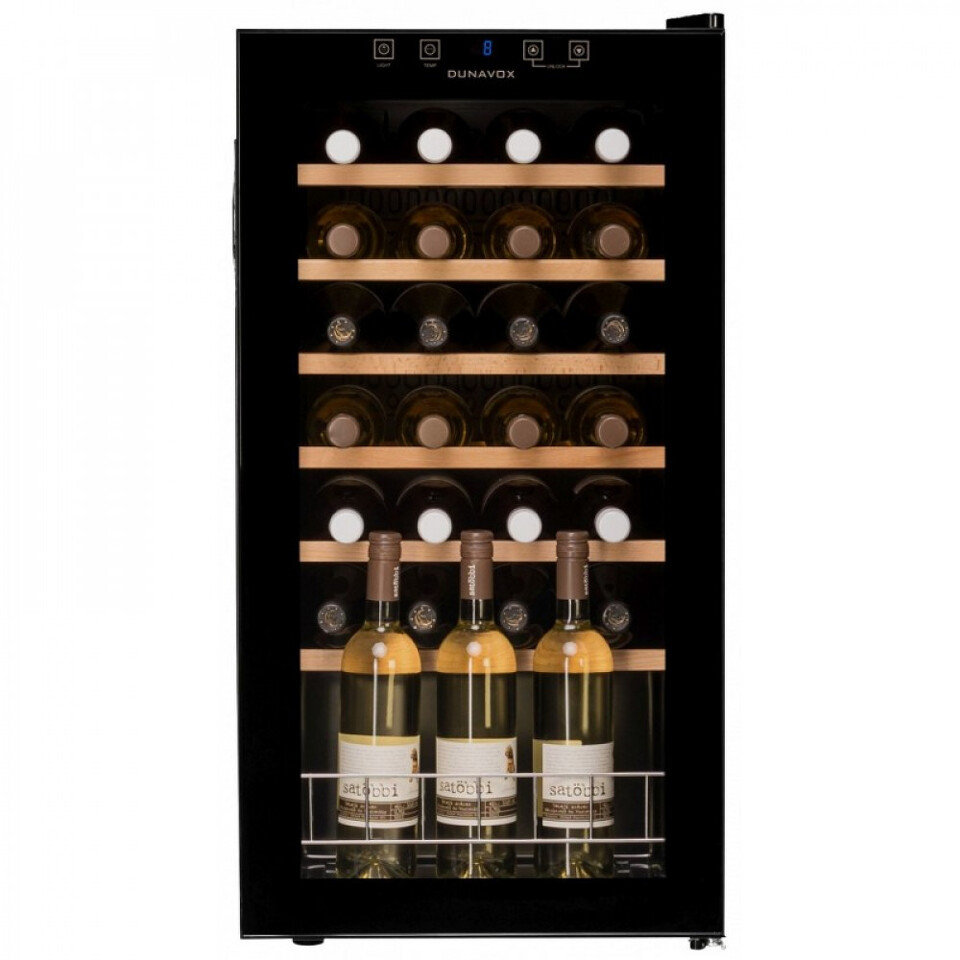 Стандартная вместимость шкафа Dunavox DX-28.88K = 28 бутылкам, максимальная вместимость составляет 30 бутылок, 4 из которых можно разместить в вертикальном положении для хранения открытого вина или наглядной демонстрации.