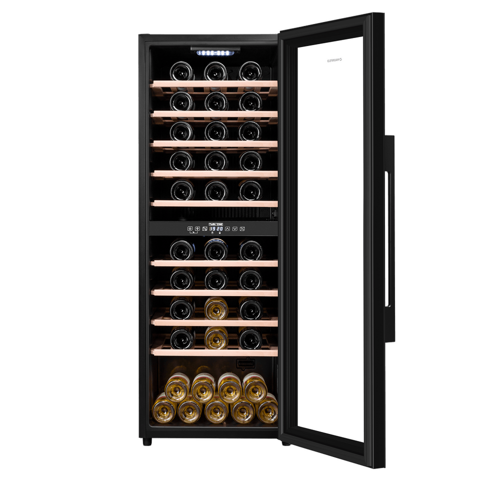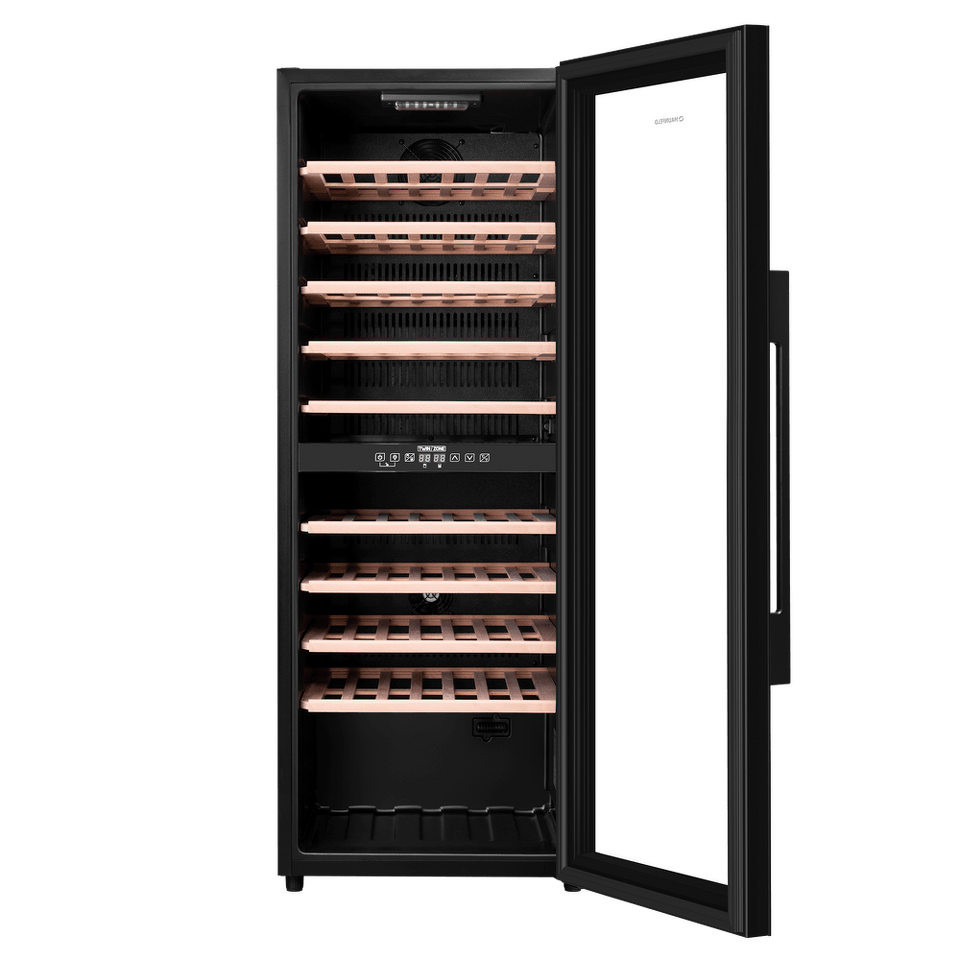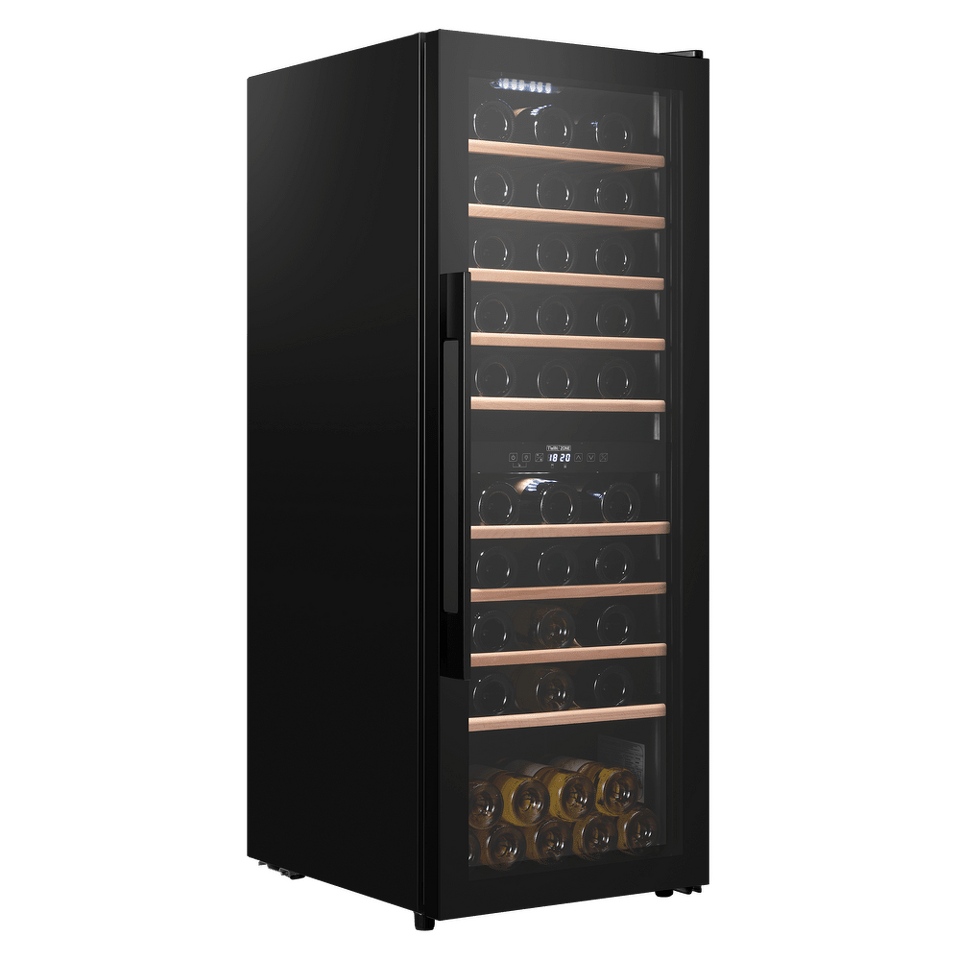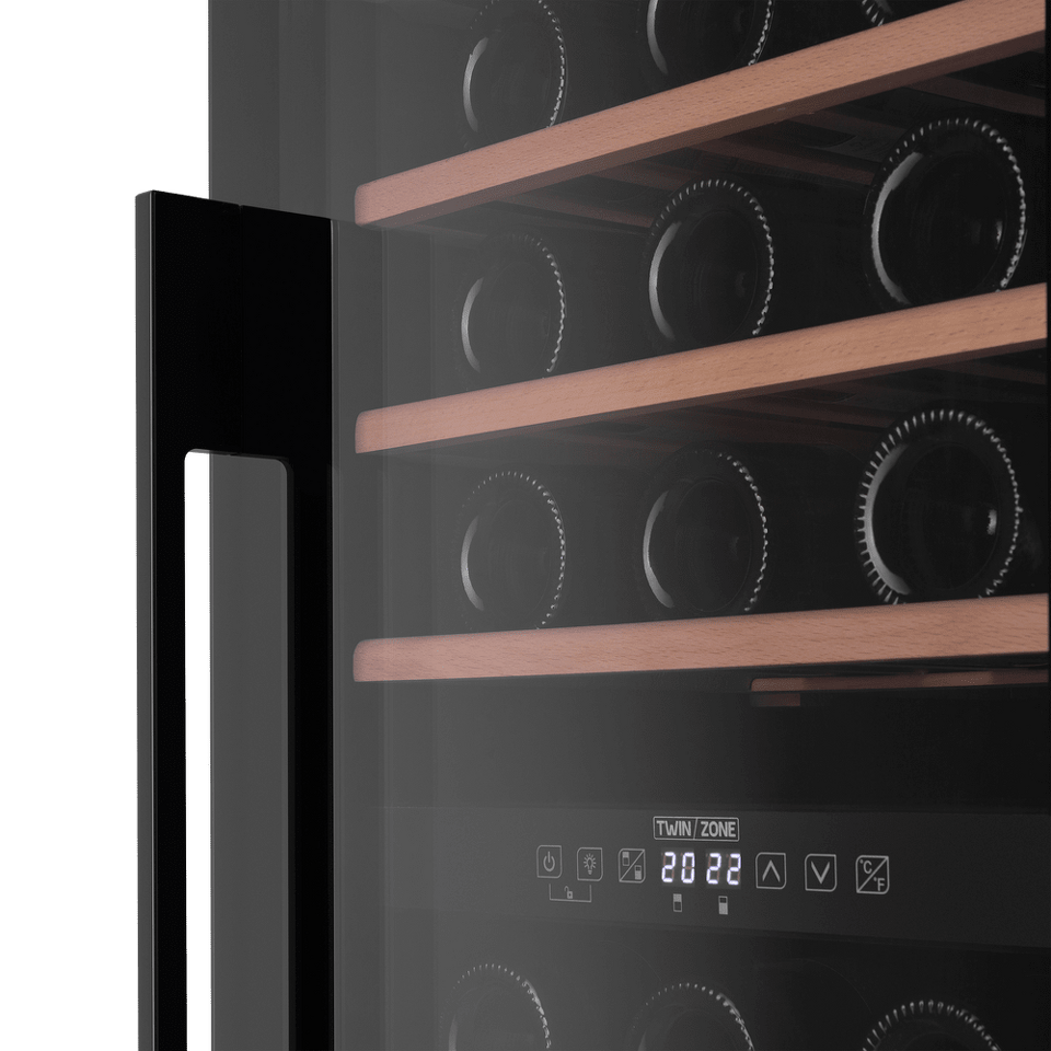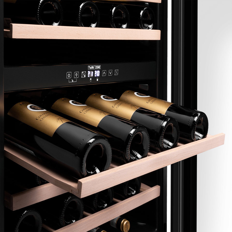 Шкаф имеет две зоны, для каждой из них можно задать свой режим охлаждения — это актуально для тех, кто планирует хранить дома разные виды напитка: красное, белое, шампанское.