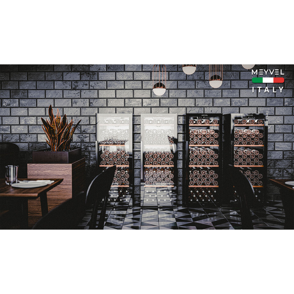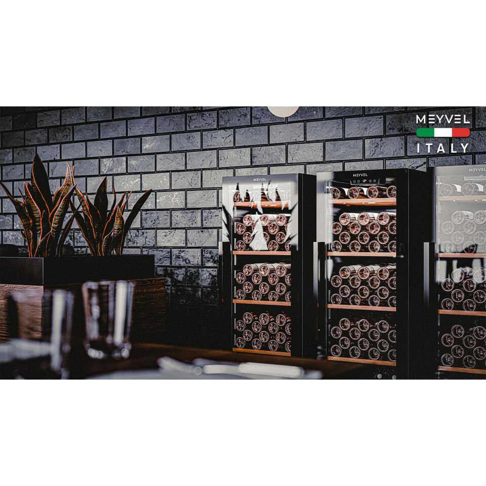 Meyvel MV105-KBF1 — отдельностоящее устройство, поэтому можно разместить его в любом удобном месте ресторана, отеля, бара или домашней винной комнаты без встраивания в мебель. Это удобно не только для создания стиля и атмосферы в интерьере, но и для предоставления легкого доступа к винам.