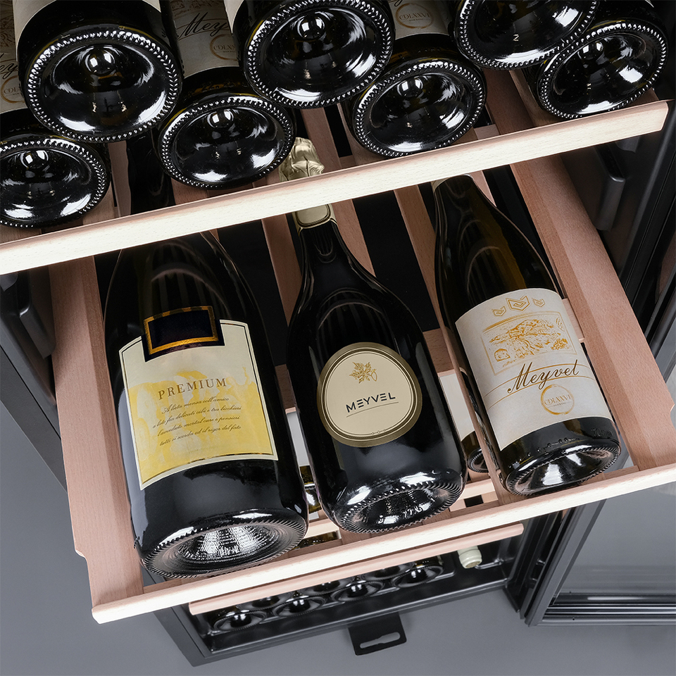 Meyvel MV105-KBF1 поддерживает температуру от +5 до +20°C, которая идеальна для белых, красных вин и шампанского. Благодаря большому расстоянию между полками в шкаф помещаются не только бутылки 0,75 л типа «Бордо», но и большего объема.