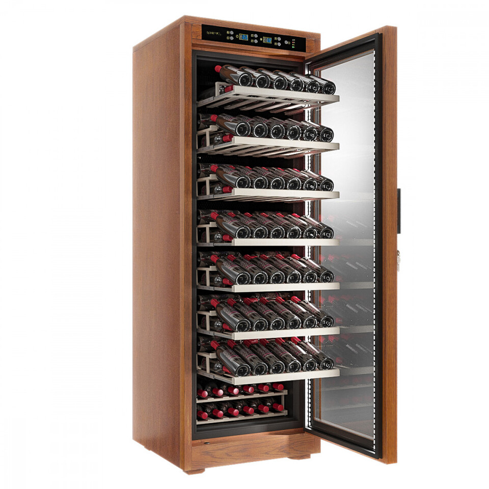 Для размещения винных бутылок, шкаф оснащен 13 специальными крепкими полками из массива бука: нижняя (1), универсальная (9), демонстрационная (2), полка с водным резервуаром (1). Для того, чтобы циркуляция воздуха была максимально качественной и равномерной, необходимо размещать бутылки с вином так, что бы они не соприкасались со стенкой испарителя.