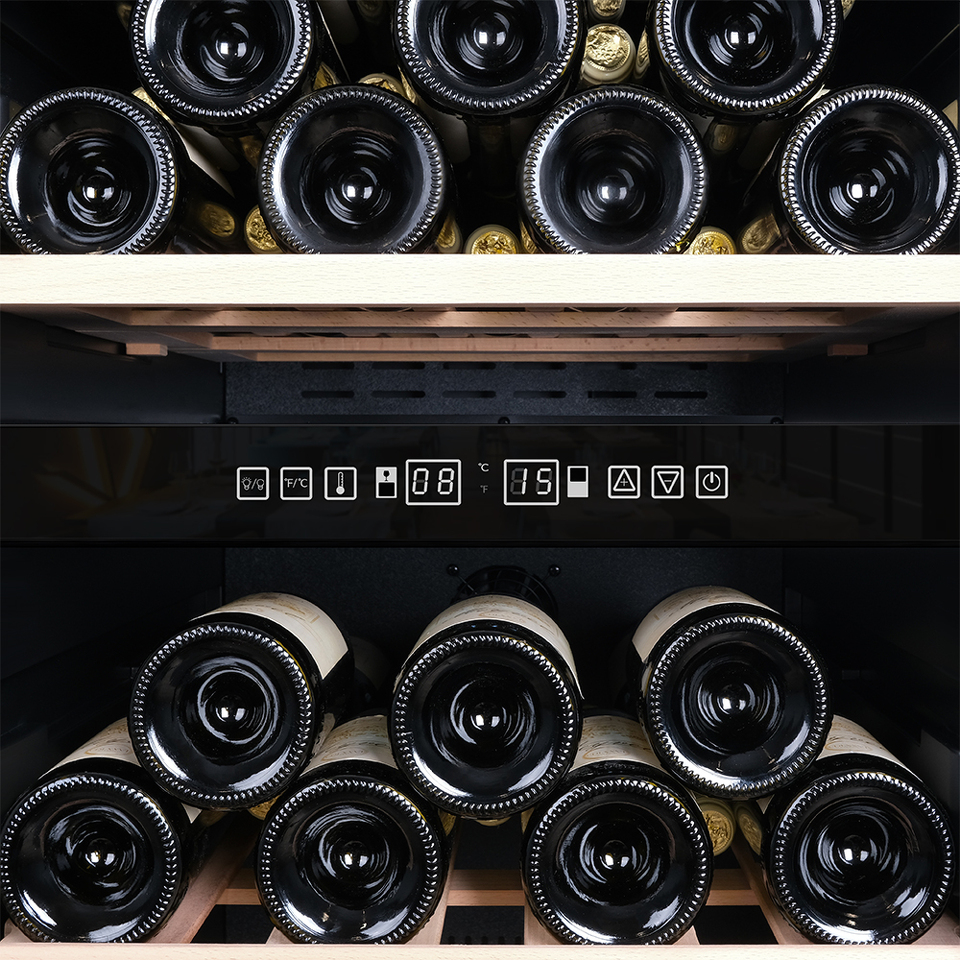 Управление осуществляется через сенсорную панель, а настройка интуитивно понятна. Также предусмотрены важные функции для защиты винотеки: замок на двери для безопасности, угольный фильтр, который очищает воздух внутри шкафа от посторонних запахов, сигнализация отклонения температуры, которая предупреждает о любых изменениях в условиях хранения, и блокировка панели управления, предотвращающая случайные изменения настроек.