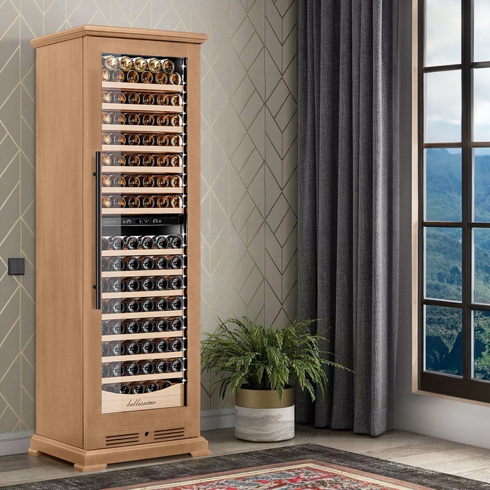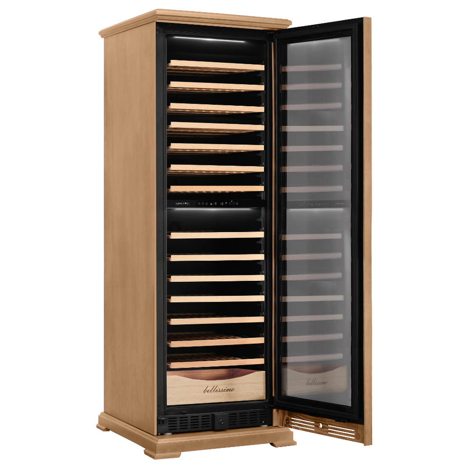 Винный шкаф предназначен для профессионального и длительного хранения различных сортов вин (до 163 бутылок типа Бордо). Он так же оснащен дверью с защитой от ультрафиолетовых лучей и поддерживает влажность в диапазоне 60-80%, как в настоящем винном погребе. Стальной корпус обшит натуральным буком, который выдерживает большие нагрузки и обладает красивой текстурой.