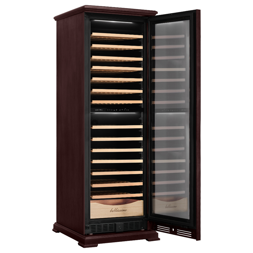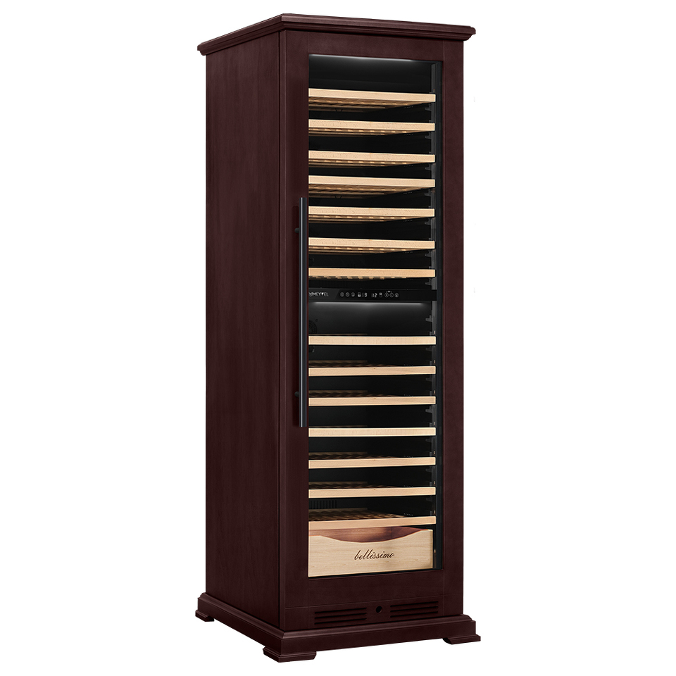 Винный шкаф предназначен для профессионального и длительного хранения различных сортов вин (до 163 бутылок типа Бордо). Он так же оснащен дверью с защитой от ультрафиолетовых лучей и поддерживает влажность в диапазоне 60-80%, как в настоящем винном погребе. Стальной корпус обшит натуральным буком, который выдерживает большие нагрузки и обладает красивой текстурой.