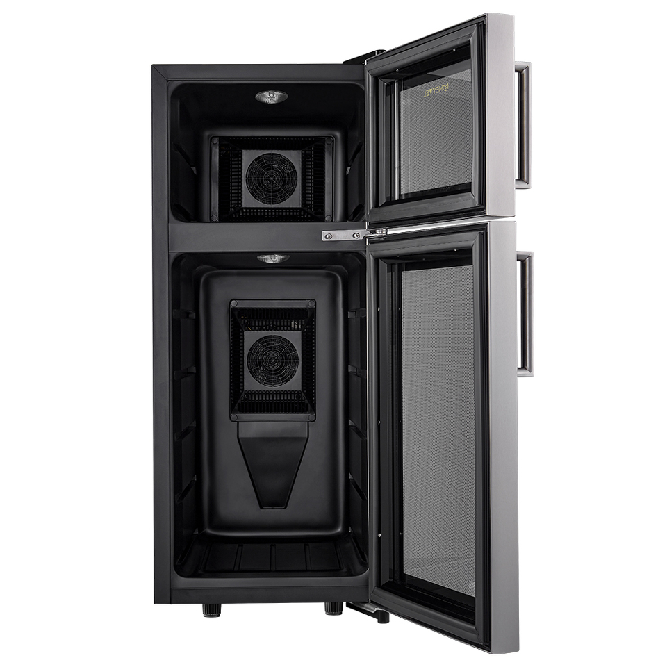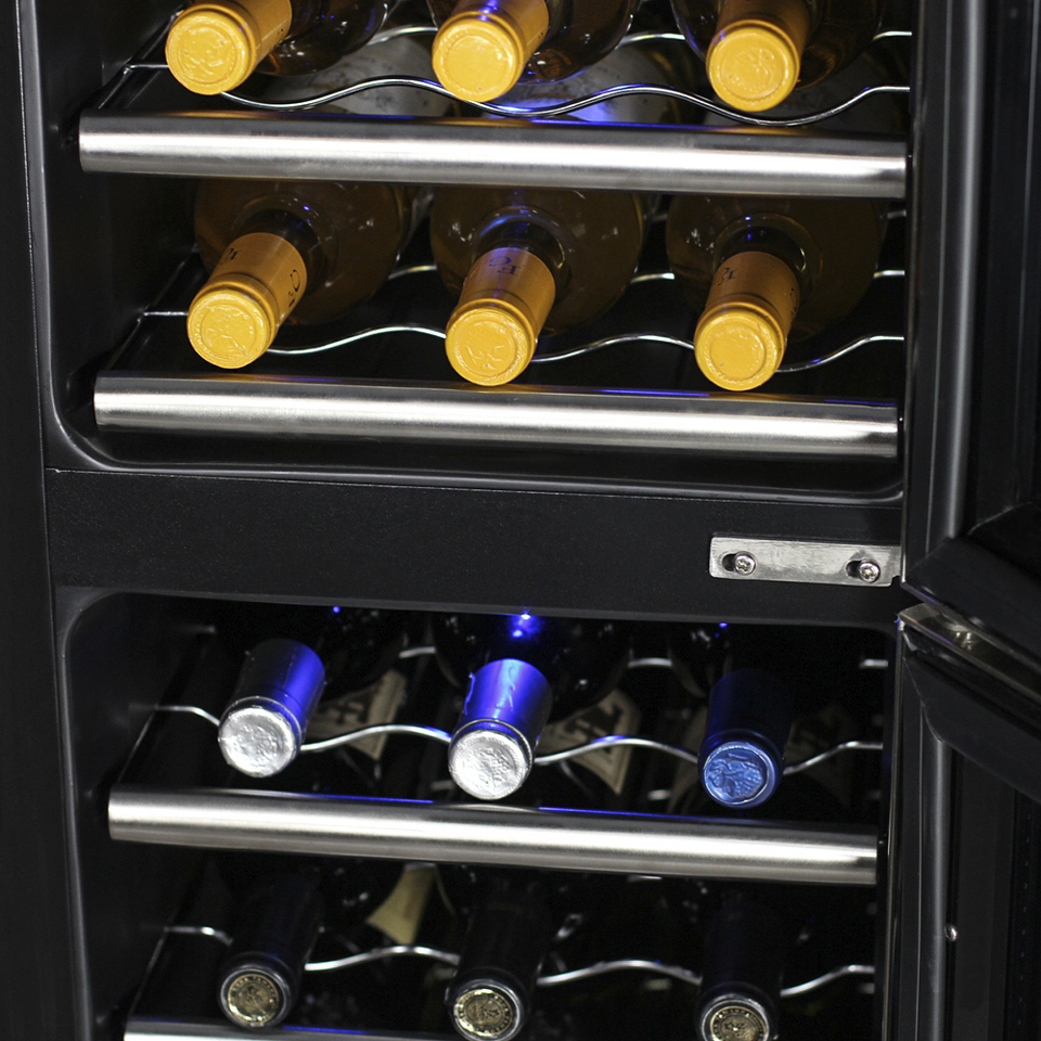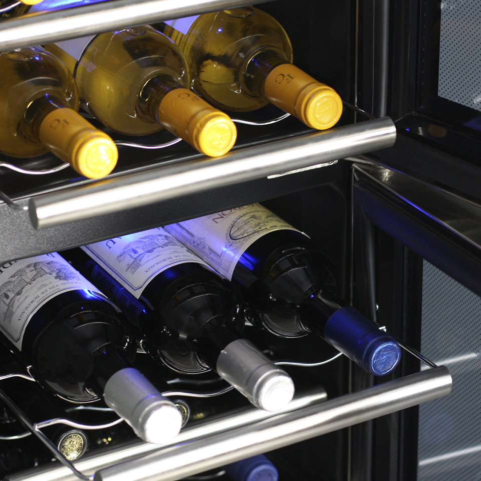 Термоэлектрический винный шкаф имеет две температурные зоны, храните красные и белые вина в одном месте! Данная модель поддерживает необходимый для хранения вин уровень влажности в 50-80%.