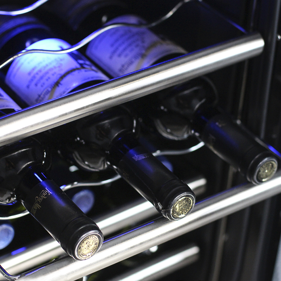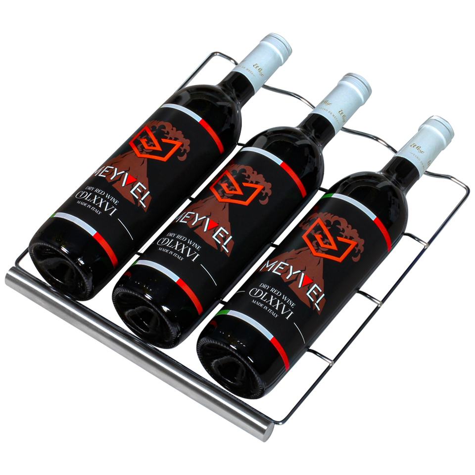 Двойное стекло с защитой от прямых УФ-лучей поддерживает качественные условия хранения вина. Для размещения винных бутылок, шкаф оснащен 7 полками из хромированного металла.
