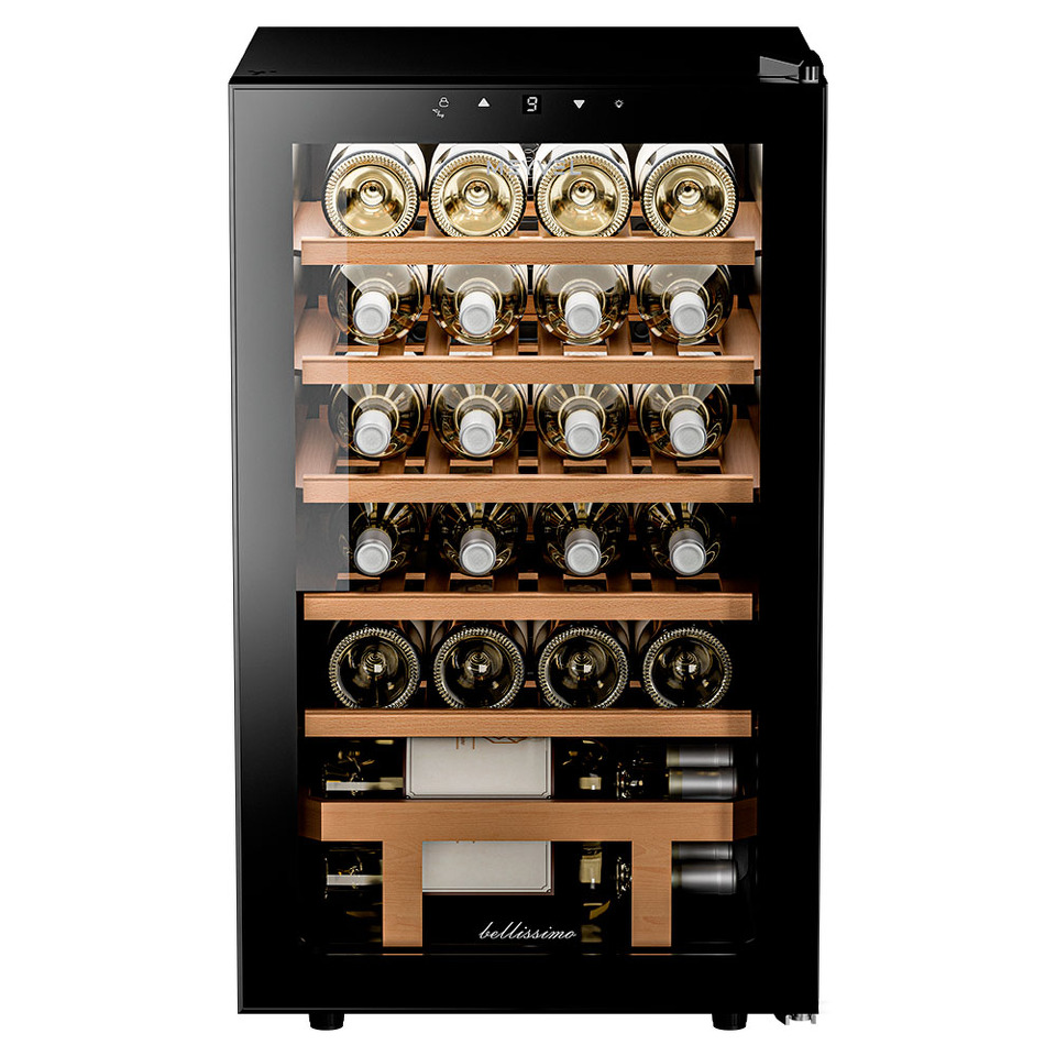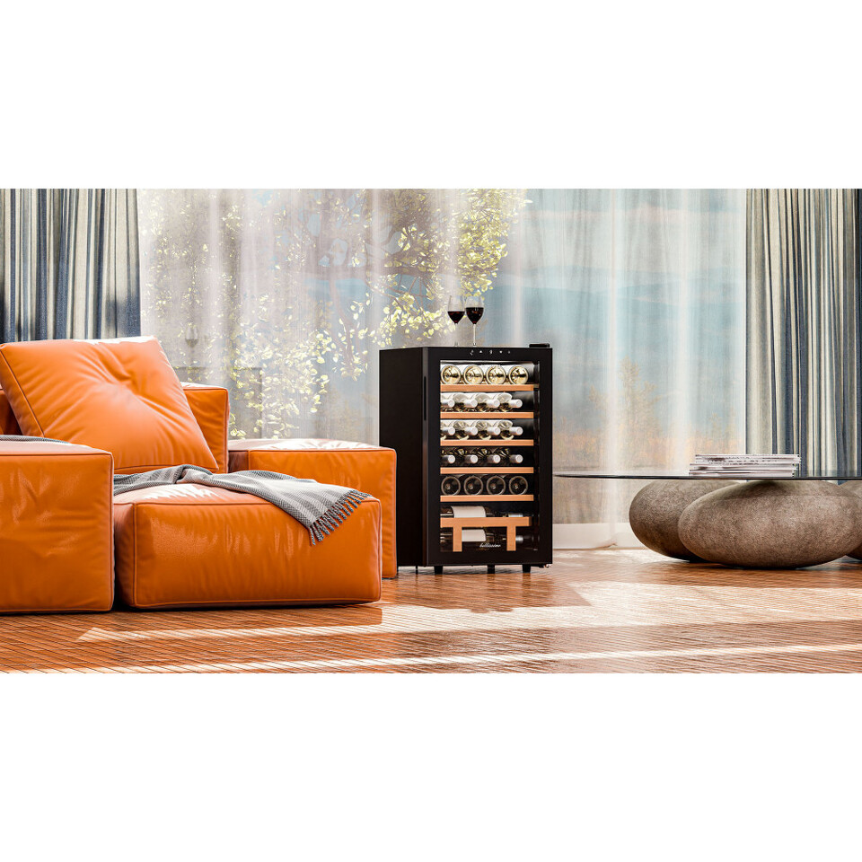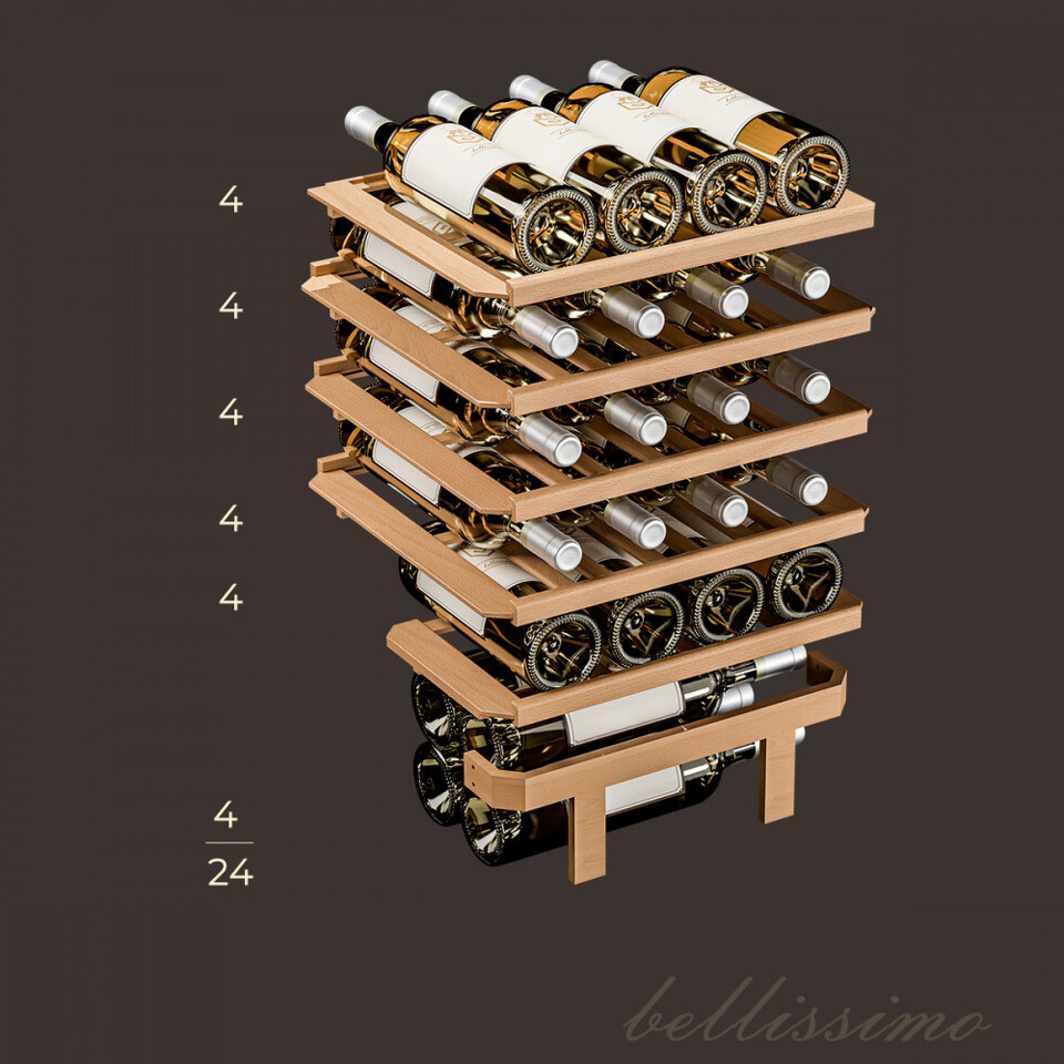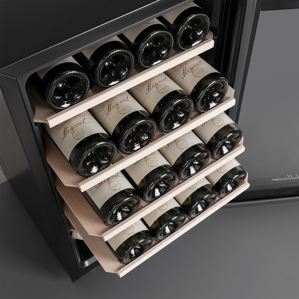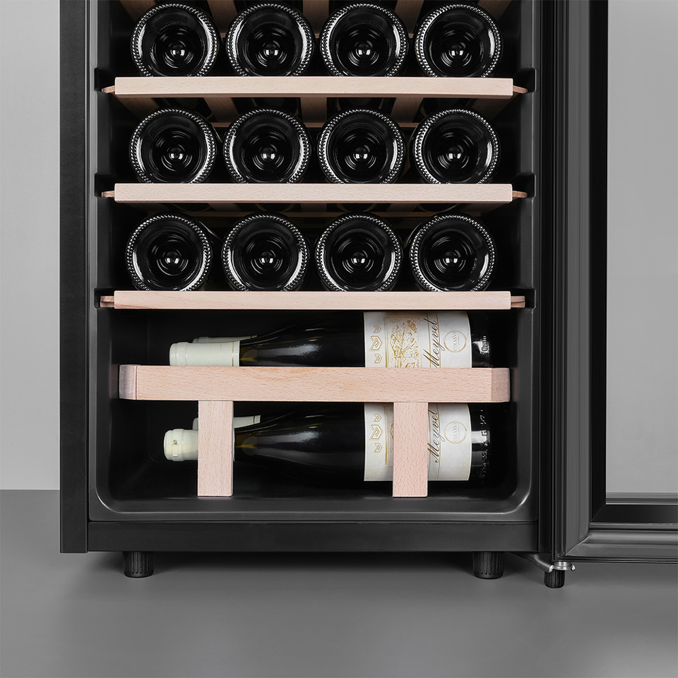 5 выдвижных полок из бука обеспечат удобный доступ к содержимому, а нижняя полка презентует лучшие единицы винотеки. Встроенная система сигнализации отклонения температуры гарантирует, что напитки будут храниться при правильных условиях.