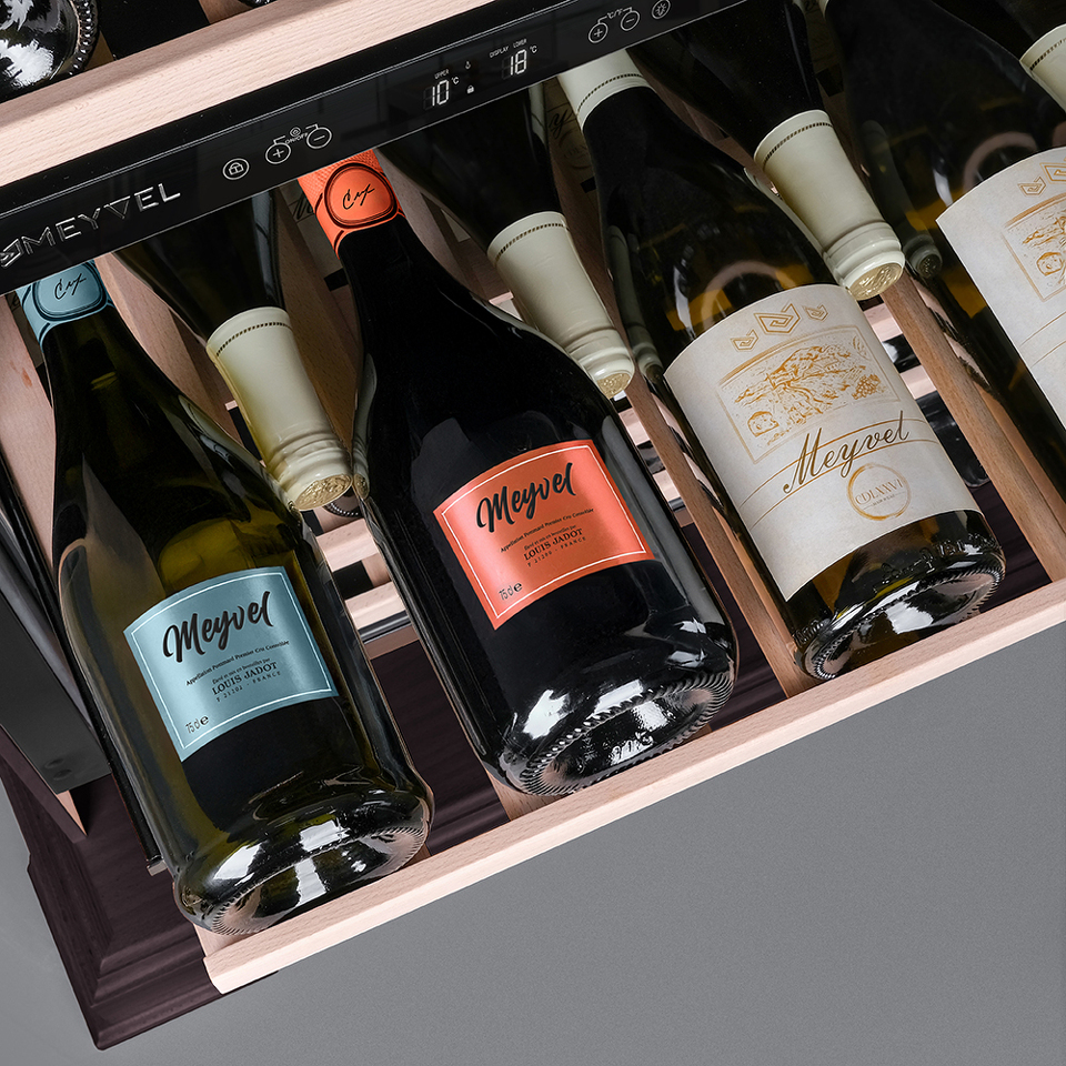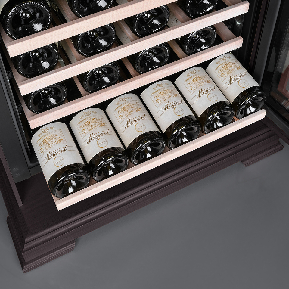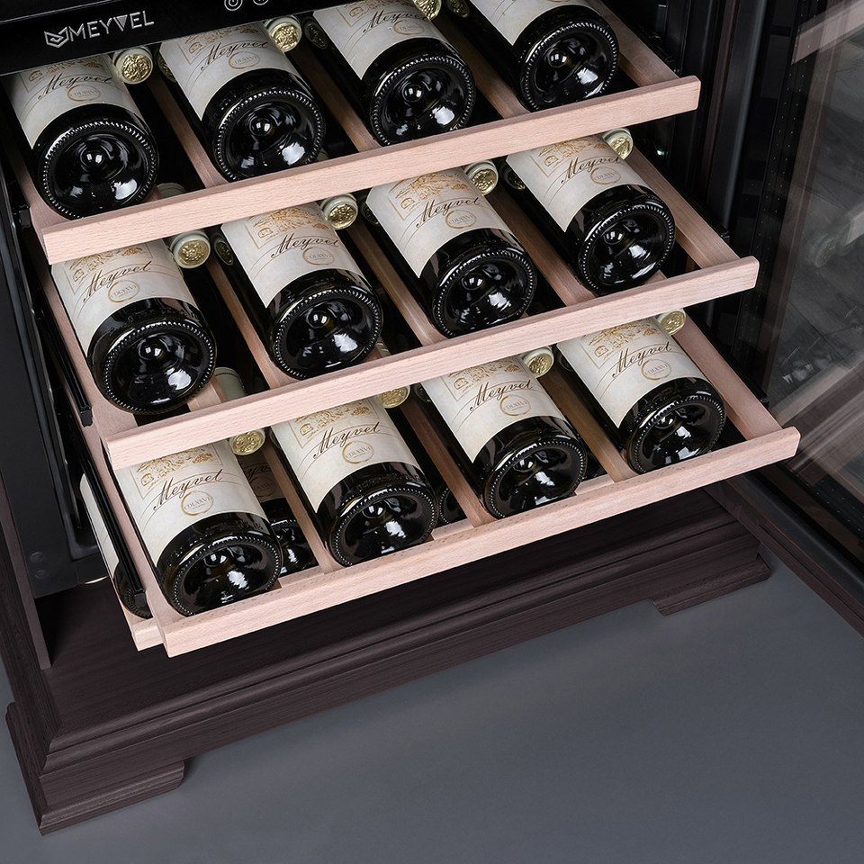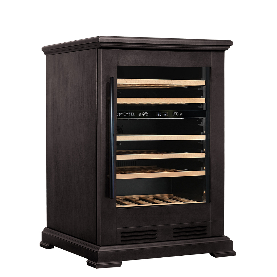 Компрессорный винный шкаф Meyvel MV46PRO-KBT2 (Тёмный шоколад) обладает большой вместимостью и даёт возможность разместить до 46 бутылок стандартного типа Бордо (0,75 л). Располагаются они на выкатных полках из дерева. Внутреннее пространство шкафа разделено на 2 температурные зоны, с возможностью настраивать каждую из них. Диапазон верхней зоны варьируется от +5°C до +12°C, а нижней - от +12°C до +20°C.