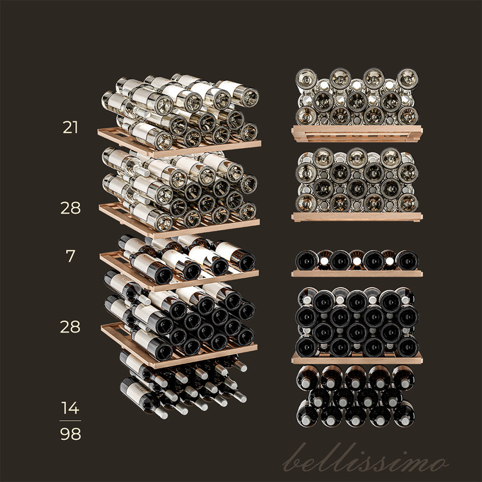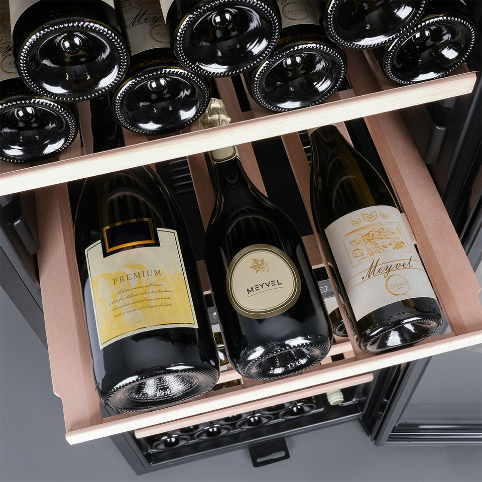 Meyvel MV98-KBF2 оборудован двумя температурными зонами, чтобы эффективно хранить различные сорта вин. В верхней зоне температура регулируется в диапазоне от +5 до +12°C, которая идеальна для белых вин и шампанского. Нижняя зона предлагает температурный режим от +12 до +20°C, подходящих для красных вин. Это обеспечивает индивидуальный подход к каждому виду вина. Благодаря большому расстоянию между полками в шкаф помещаются не только бутылки 0,75 л типа «Бордо», но и большего объема.