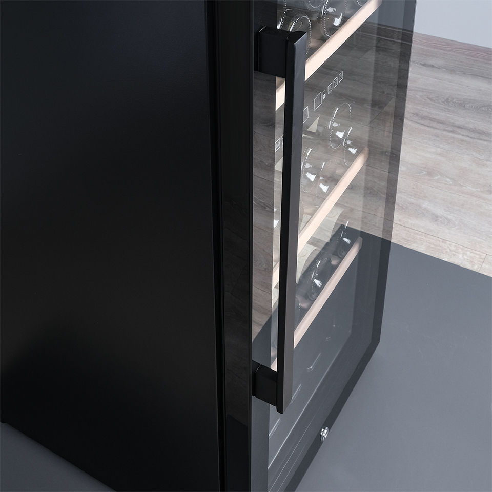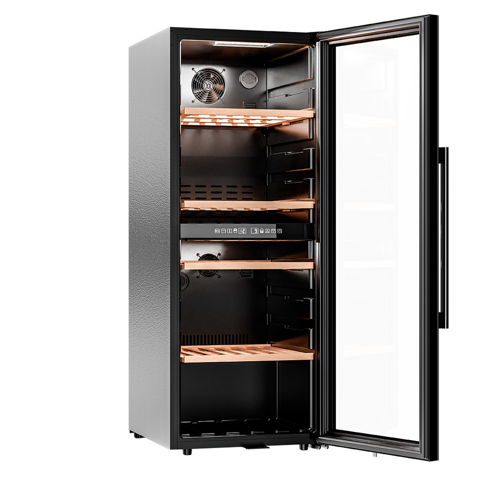 Управление осуществляется через сенсорную панель, а настройка интуитивно понятна. Также предусмотрены важные функции для защиты винотеки: замок на двери для безопасности, угольный фильтр, который очищает воздух внутри шкафа от посторонних запахов, сигнализация отклонения температуры, которая предупреждает о любых изменениях в условиях хранения, и блокировка панели управления, предотвращающая случайные изменения настроек.