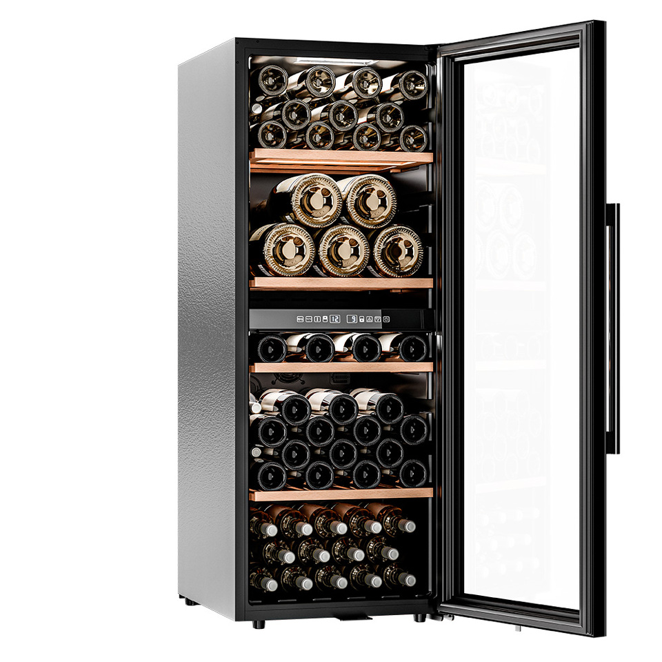 Модель оснащена четырьмя полками из дерева, что не только выглядит стильно, но и способствует правильной циркуляции воздуха внутри шкафа. Двойное стекло с УФ-фильтром надежно защищает вино от вредного воздействия света, что сохраняет его уникальный вкус и аромат.