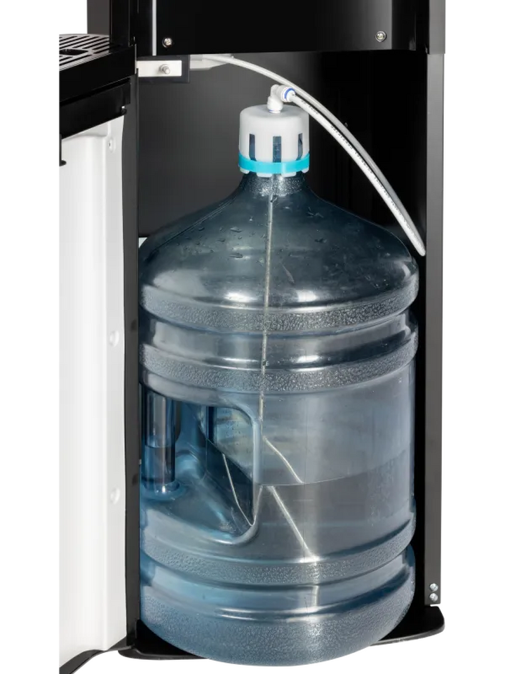 Пластиковая бутыль устанавливается в скрытой нише напольного кулера. Нижняя загрузка воды не только экономит пространство, но и сохраняет эстетику интерьера, не создавая визуальный шум.