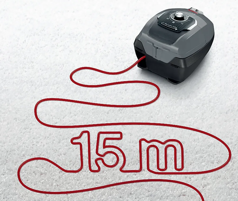 Пылесос оснащен четырьмя колесами для удобства перемещения и автосматыванием сетевого шнура. Радиус действия составляет 15 метров, что позволяет убирать большие помещения без необходимости переключения розеток. Потребляемая мощность устройства составляет 1800 Вт, что обеспечивает его высокую производительность.