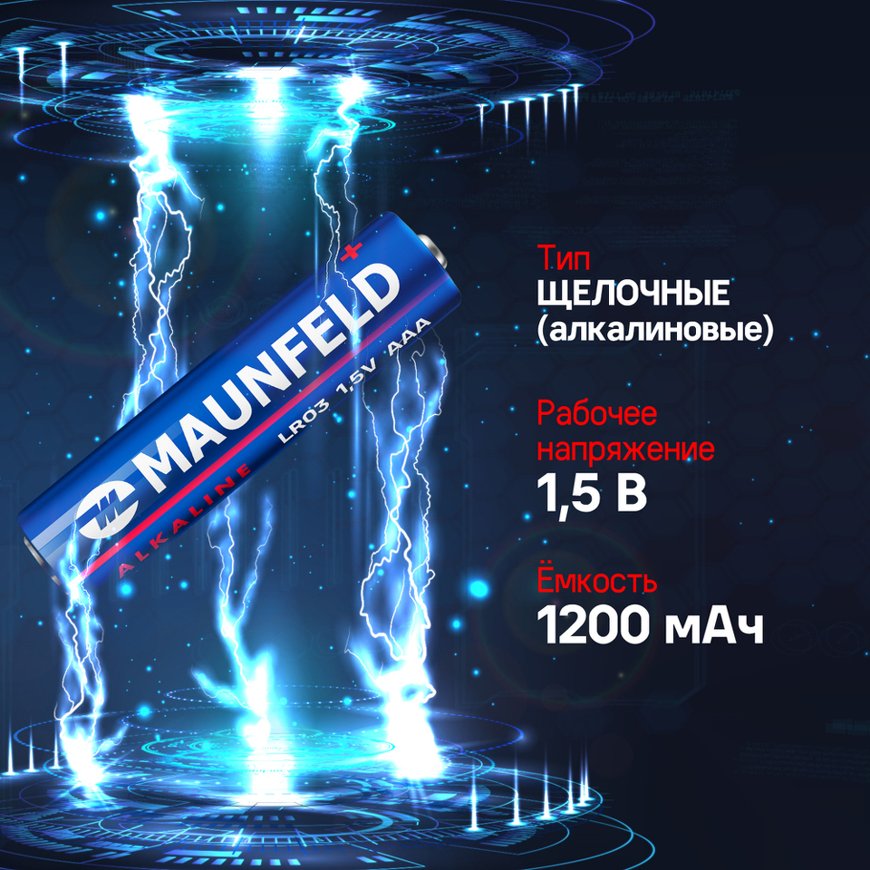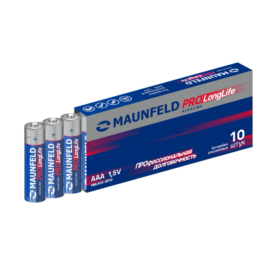 Батарейки MAUNFELD Pro Long Life Alkaline AAA (LR03), также имеют рабочее напряжение 1,5 В, что обеспечивает стабильную работу устройств.