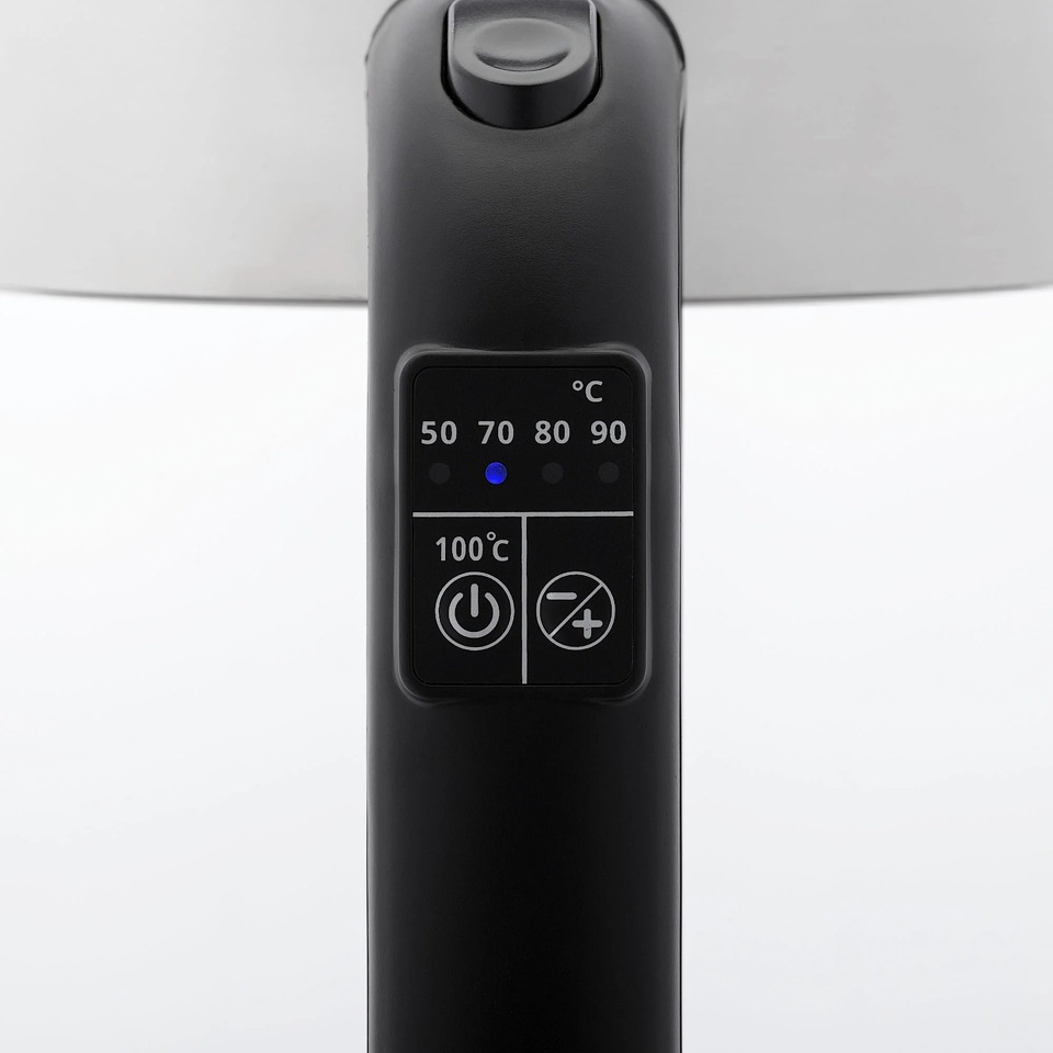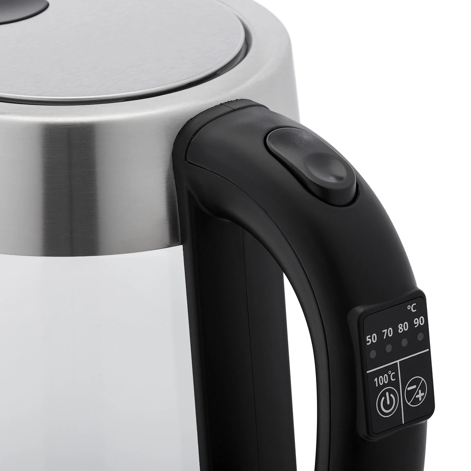 Объем 1,7 л. Мощность 2200 Вт. Контроллер Strix (до 15 000 включений, разработано в Великобритании, патент). Скрытый нагревательный элемент, нержавеющая сталь. Корпус из стекла с элементами из нержавеющей стали. Цифровое управление: регулировка и поддержание температуры. 5 режимов нагрева: 100-90-80-70-50С. Поддержание выбранной температуры (2 часа). Удобное управление на ручке. Цветная подсветка корпуса в зависимости от выбранной температуры. Шкала уровня воды. Тройная защита: от сухого кипячения, при снятии чайника, при закипании. Вращение на 360 градусов. Система «идеальный носик». Открытие крышки кнопкой. Звуковые сигналы.