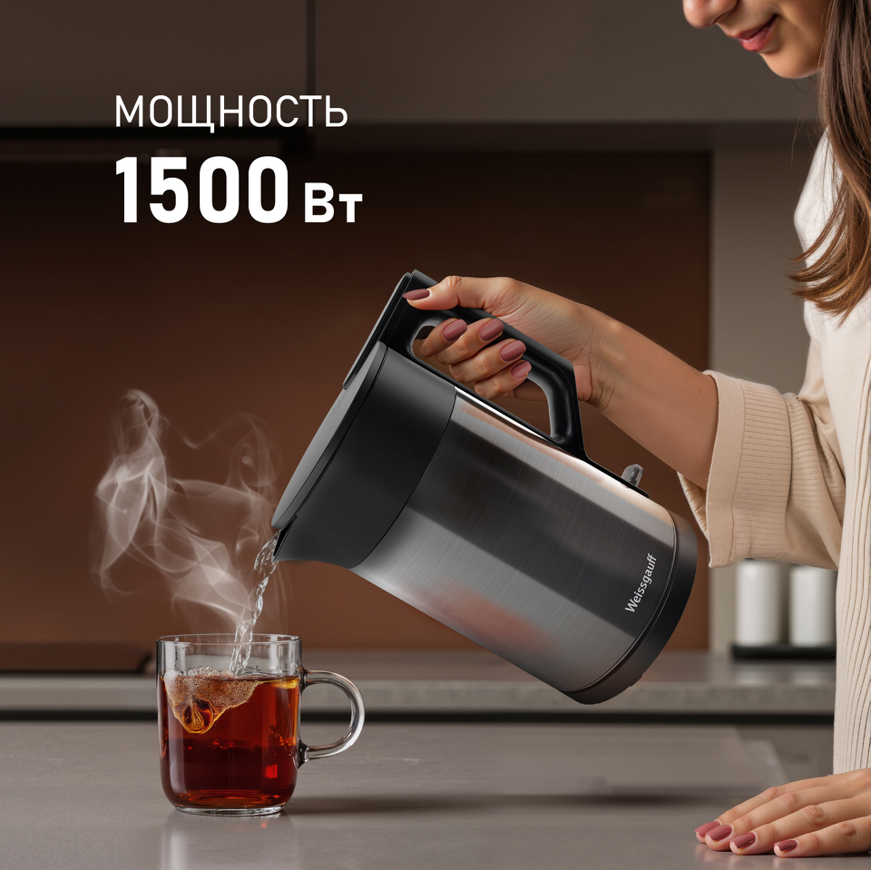 Вместительный электрический чайник от Weissgauff, выполненный в черном цвете, обладает объемом 1,7 литра и инновационной контактной группой Strix осуществляющей автоотключение после закипания и без воды, обеспечит удобство и безопасность использования электрического чайника на вашей любимой кухне!