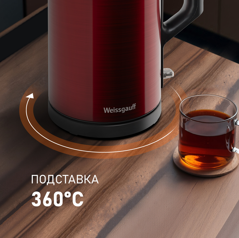Вместительный электрический чайник от Weissgauff, выполненный в красном цвете, обладает объемом 1,7 литра и инновационной контактной группой Strix осуществляющей автоотключение после закипания и без воды, обеспечит удобство и безопасность использования электрического чайника на вашей любимой кухне!