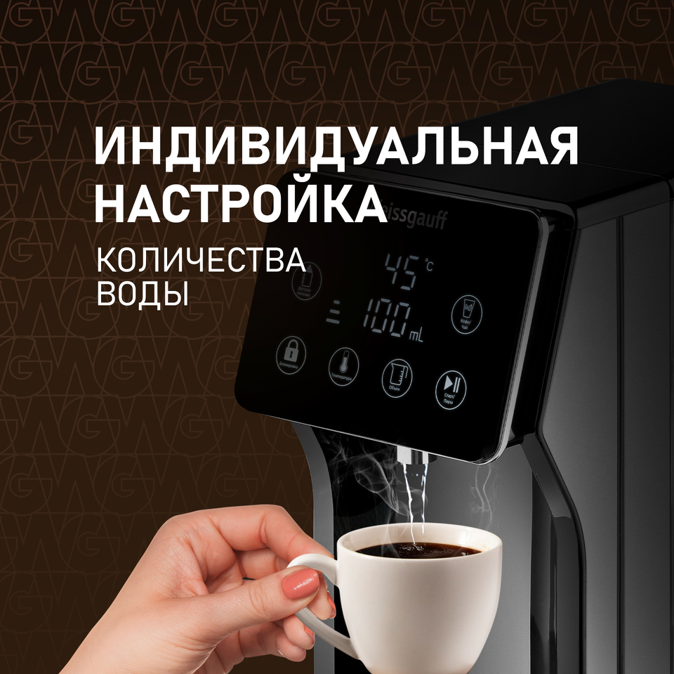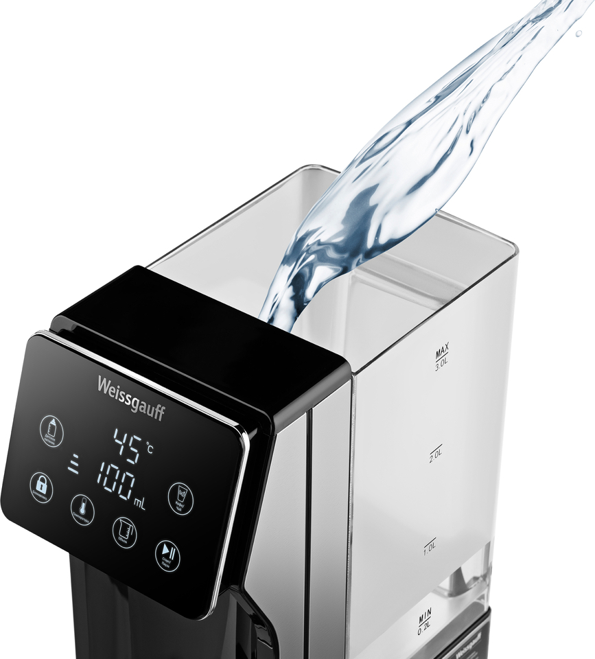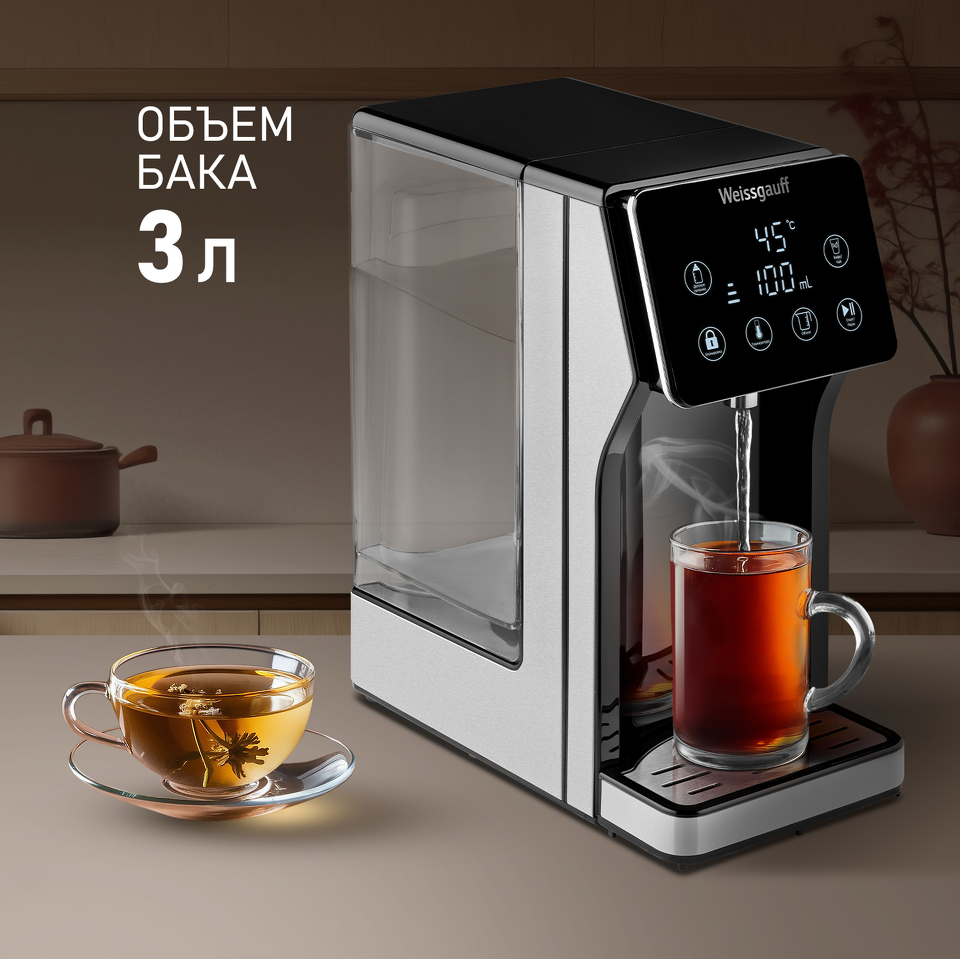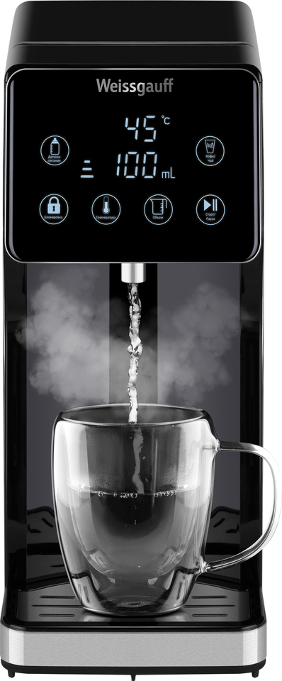 Вместительный и функциональный термопот от Weissgauff, оснащенный проточным нагревателем, позволяющим получить горячую воду буквально за 5 секунд, выполненный в чёрном цвете, обладает съемным баком для воды объемом 3 литра, возможностью поддержания требуемой температуры в диапазоне от 40 до 100 °C, а также 7 уровнями регулировки нагрева и двумя быстрыми функциями "Детское питание" и "Кофе/Чай".