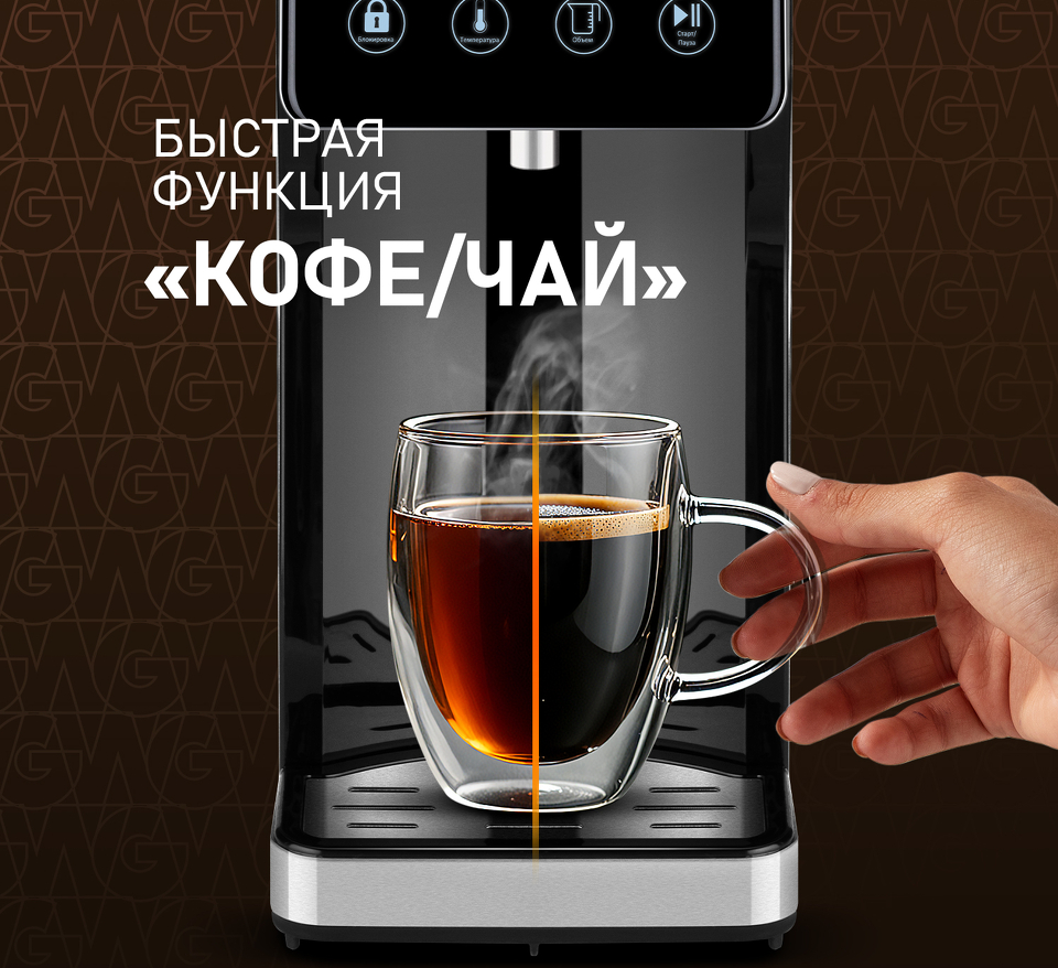 Быстрая функция "Кофе/Чай" - позволит подать воду, нагретую до температуры 90 °C, что идеально подойдет для приготовления ароматного горячего кофе или душистого свежезаваренного чая!