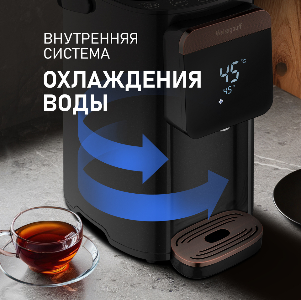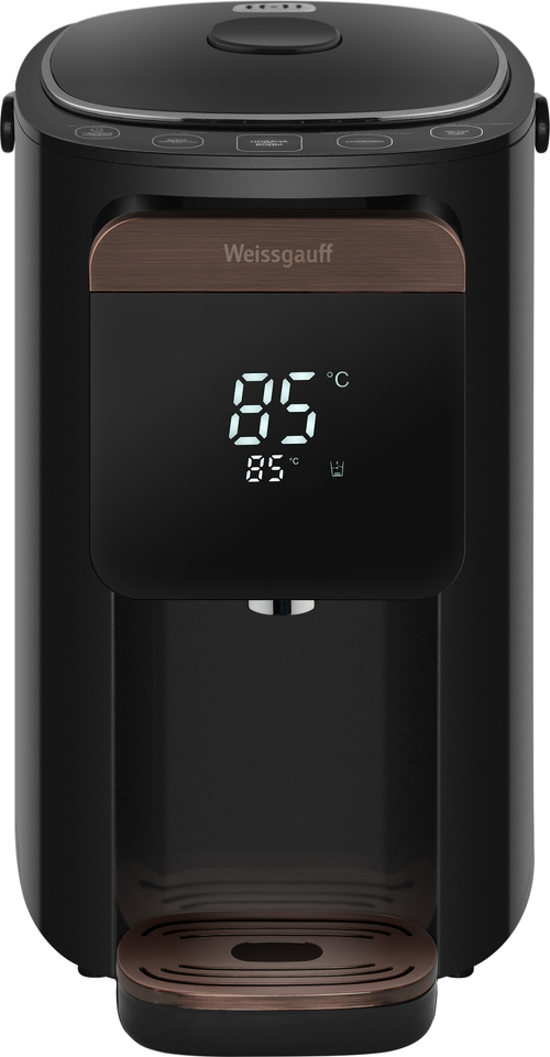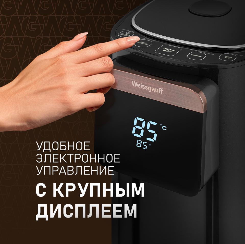 Вместительный и функциональный накопительный термопот от Weissgauff, выполненный в темно-сером цвете, обладает баком для воды объемом 5 литров, возможностью поддержания требуемой температуры в диапазоне от 45 до 95 °C, а также 6 уровнями регулировки нагрева, функциями повторного кипячения, быстрой очистки и приготовления щелочной воды.