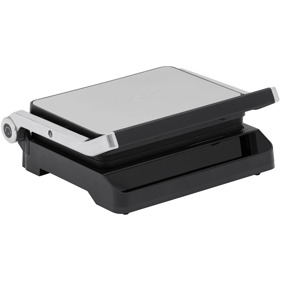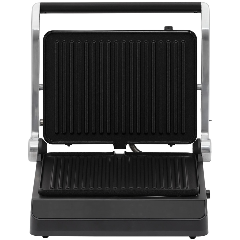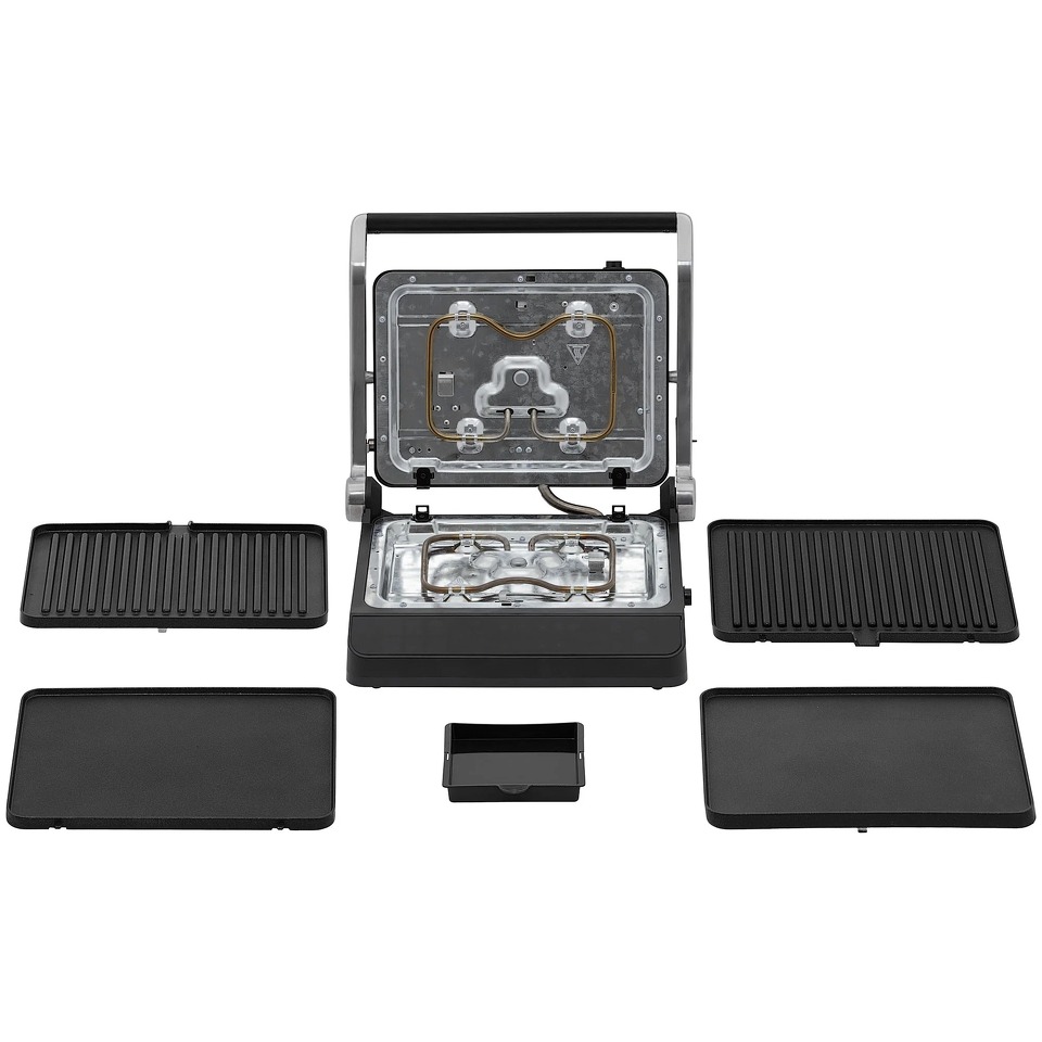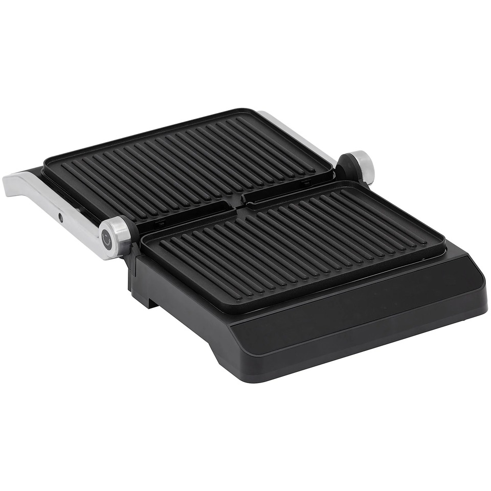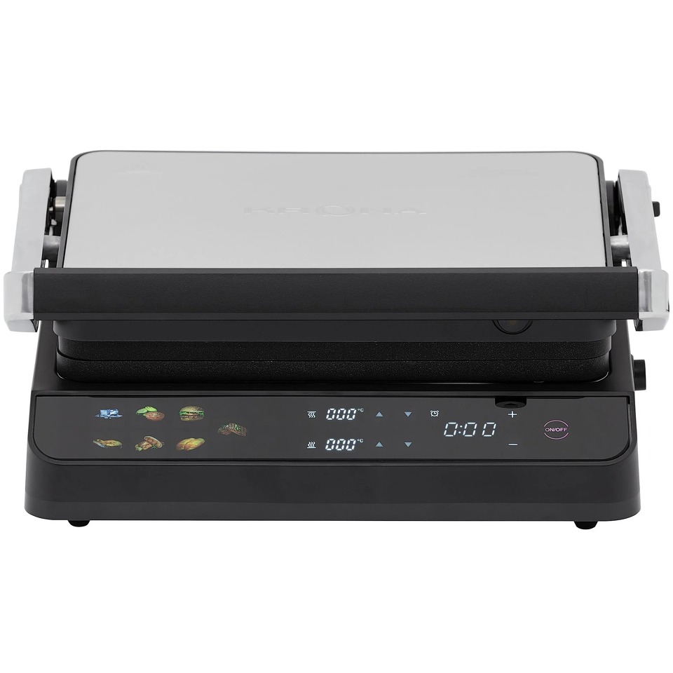 KRONA Digitaler Kontaktgrill 2000W — ваш универсальный помощник в приготовлении вкусных и разнообразных блюд. Модель мощностью 2000 Вт с сенсорным управлением и ярким цветным дисплеем в надежном корпусе из нержавеющей стали и качественного пластика. Широкие гладкие и гриль-пластины позволяют готовить любые блюда: от простых овощей до оригинальных горячих бутербродов. Регулируйте температуру от 90°C до 230°C с точностью до 5°C отдельно для верхней и нижней пластины для наилучшего результата. Гриль оснащен 10 автоматическими режимами, включая разморозку, приготовление тостов, рыбы, стейков и сосисок. Выбирайте степень прожарки стейков на свой вкус — от rare до well done. Гриль работает как в закрытом, так и в открытом режиме с углом раскрытия 105° и 180°. Благодаря съемным панелям с антипригарным покрытием и лотку для сбора жира уборка становится быстрой и легкой. Термоизолированная ручка, нескользящие ножки и защита от перегрева обеспечивают безопасность использования.