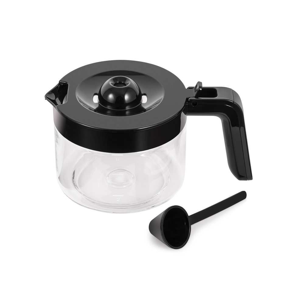 Корпус выполнен из глянцевого высококачественного пластика черного цвета с металлическими вставками. Небольшой жаропрочный кофейник объемом 0,75 л с ручкой из теплостойкого пластика рассчитан на 6 чашек. Резервуар для воды емкостью 0,83 л оснащен мерной шкалой.