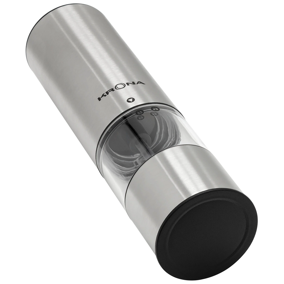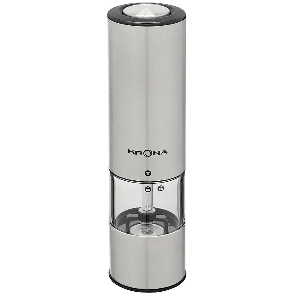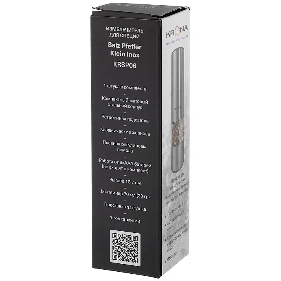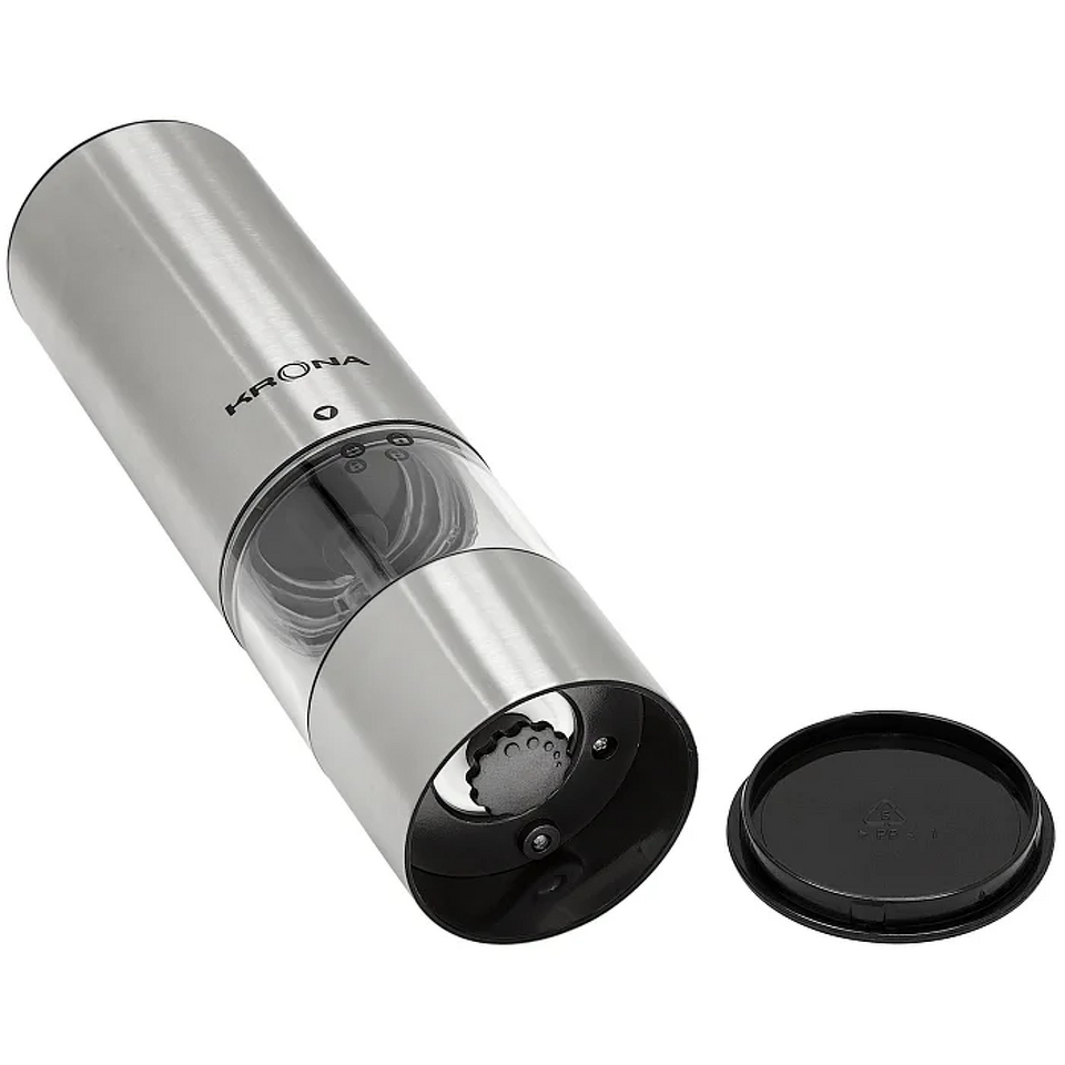 Электрический измельчитель для специй KRONA Salz Pfeffer Klein Inox — удобный и стильный аксессуар для кухни, который сочетает функциональность и элегантный дизайн. Универсальная модель подходит для измельчения соли, перца и большинства популярных специй и трав. Керамические жернова и плавная регулировка степени помола позволяют выбрать идеальную текстуру для разных задач и типов блюд. Управление максимально простое — всего одна кнопка, а встроенная подсветка делает процесс еще удобнее. Прочный матовый корпус выглядит стильно и надежно, при этом устройство имеет компактные размеры и не займет много места. Съемный контейнер объемом 70 мл (до 33 г специй) легко наполнять и очищать. В комплект входит подставка-заглушка для аккуратного хранения. Измельчитель работает от 6 батареек AAA (приобретаются отдельно) и поставляется в индивидуальной цветной упаковке — отличное решение как для личного использования, так и в качестве подарка.