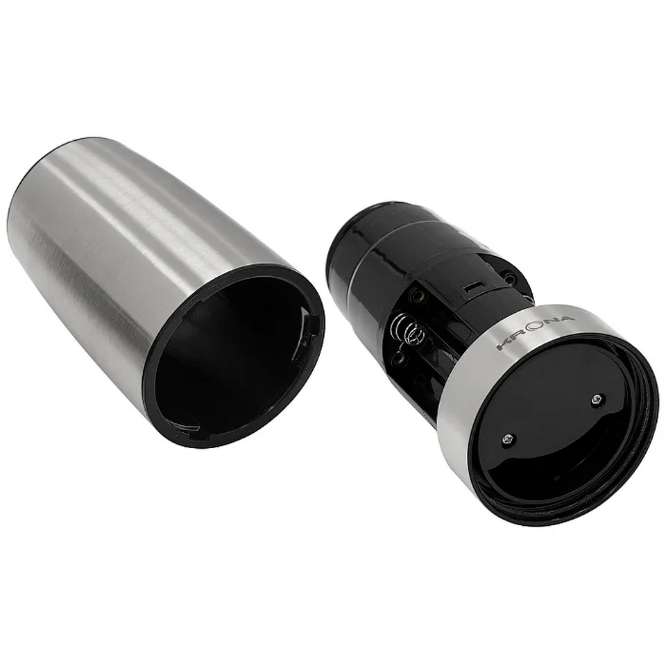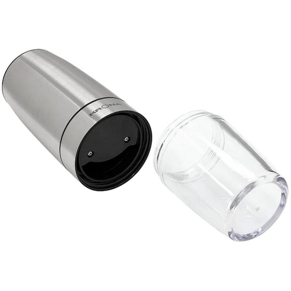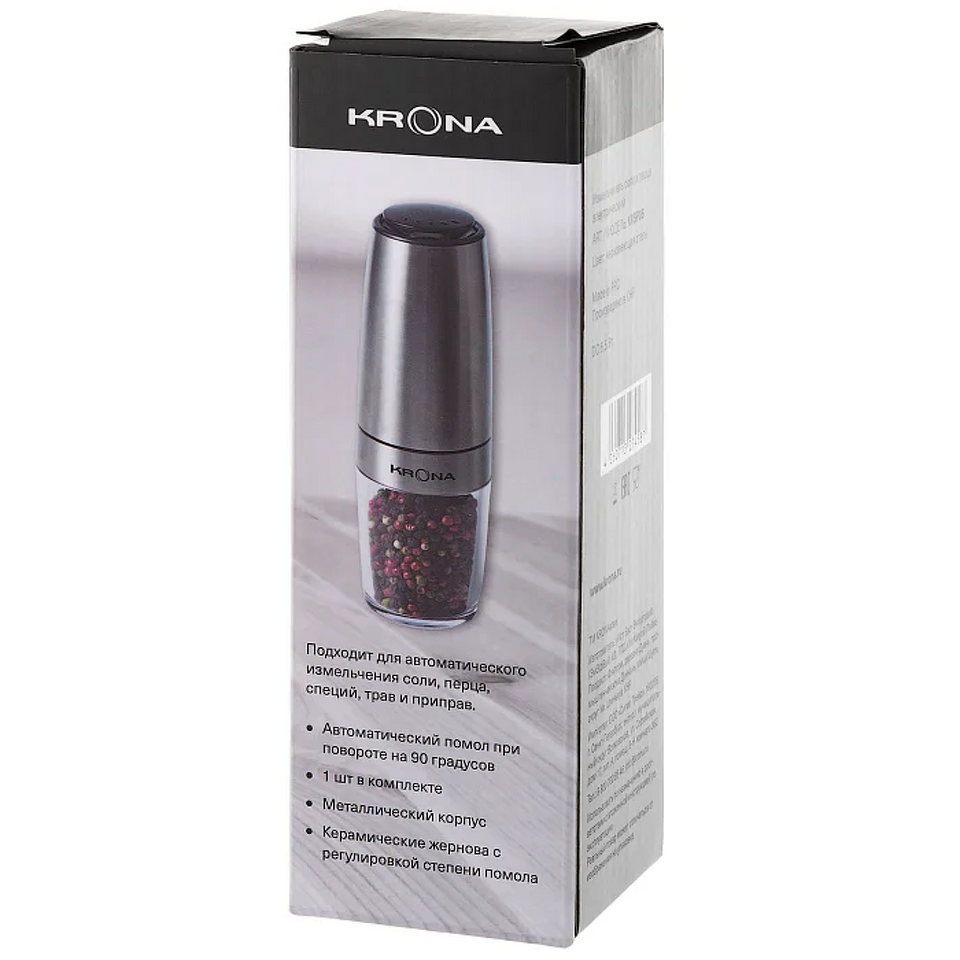 Электрический измельчитель KRONA Salz Pfeffer Schwerkraft Inox — функциональный помощник для легкого и быстрого измельчения соли, а также большинства специй и трав. Благодаря технологичной системе гравитационного управления достаточно повернуть измельчитель на 90 градусов — и он автоматически начнет работу. Прочные керамические жернова гарантируют длительный срок службы и безупречное измельчение. Плавная регулировка степени помола позволяет настроить прибор под ваши предпочтения. Матовый металлический корпус не только привлекает внимание своим современным видом, но и отличается высокой прочностью. Съемный вместительный контейнер объемом 120 мл (68 г) удобен для хранения специй. Устройство работает от 6 батареек типа ААА и поставляется в индивидуальной цветной упаковке. Сделайте процесс приготовления блюд еще приятнее с KRONA Salz Pfeffer Schwerkraft Inox.