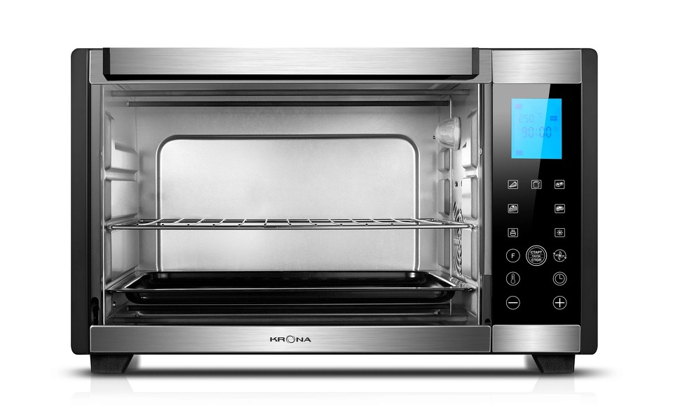 Электрическая отдельностоящая мини-печь. Объем 35 литров. Корпус из нержавеющей стали. Антипригарное покрытие камеры. Мощность 1600 Вт. Цифровое сенсорное управление. Плавная регулировка температуры до 230 С. 4 нагревательных элемента из нержавеющей стали. Таймер от 0 до 180 минут со звуковым сигналом окончания работы. 6 режимов работы: верхний нагрев, нижний нагрев, двойной нагрев, верхний нагрев с конвекцией, нижний нагрев с конвекцией, двойной нагрев с конвекцией. 7 автоматических программ: пицца, хлеб, печенье, торты, мясо, поддержание тепла, разморозка. Внутренняя подсветка. Стеклянная дверца. В комплекте: хромированная решетка, эмалированный противень, хромированная ручка. Прорезиненные ножки. Черный цвет. Ненагревающася стальная ручка дверцы.