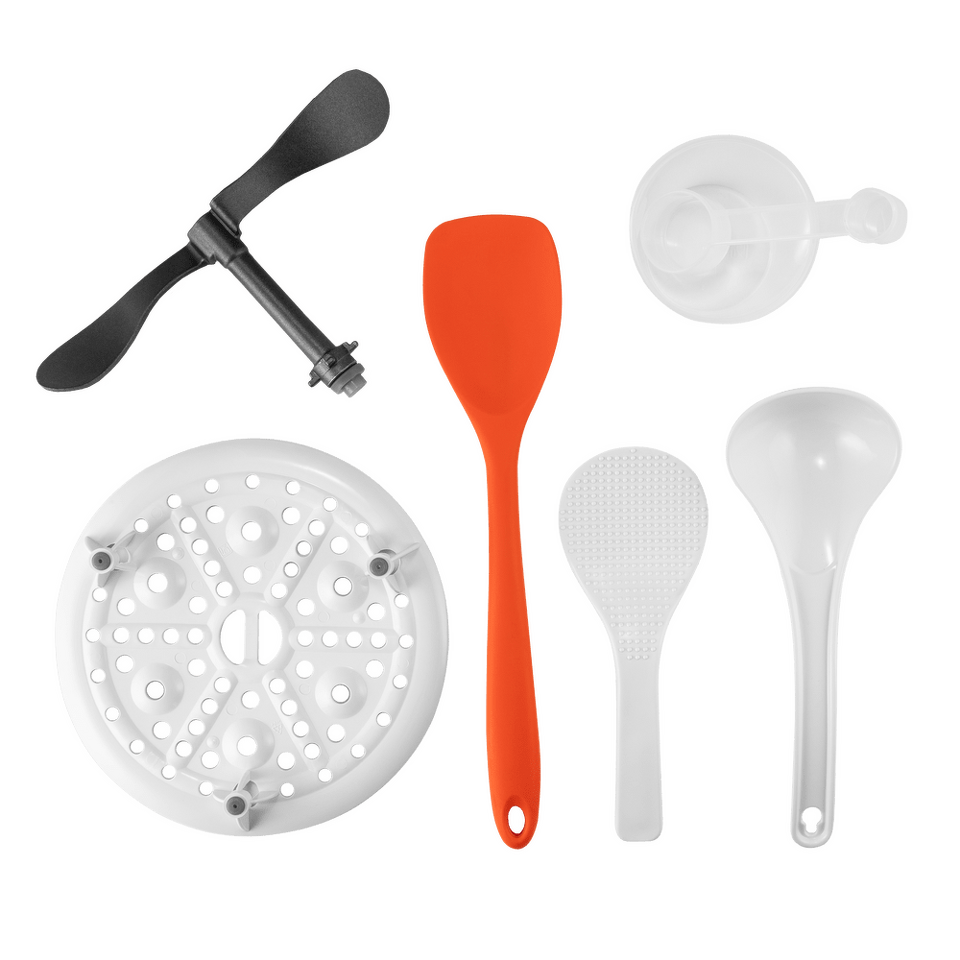 Широкая комплектация для удобства приготовления (вращающаяся лопатка для перемешивания, паровая полочка, мерный стакан, силиконовая лопатка, ложка, половник).