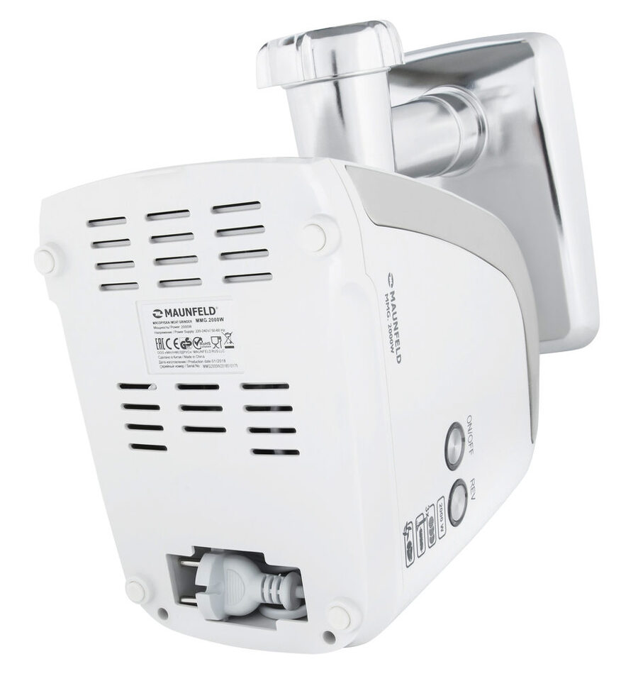Элегантный белый пластиковый корпус со вставкой цвета металлик - отличительная особенность этой модели. Сама насадка-мясорубка выполнена полностью из металла и укомплектована 3-мя дисками с диаметром отверстий 3, 4.8 и 8 мм, что позволяет получить фарш разной фракции. Диски очень удобно хранить в специальном отсеке в корпусе. Поддон для подачи мяса в мясорубку изготовлен из алюминия. В нижней части находится отсек для хранения сетевого шнура.