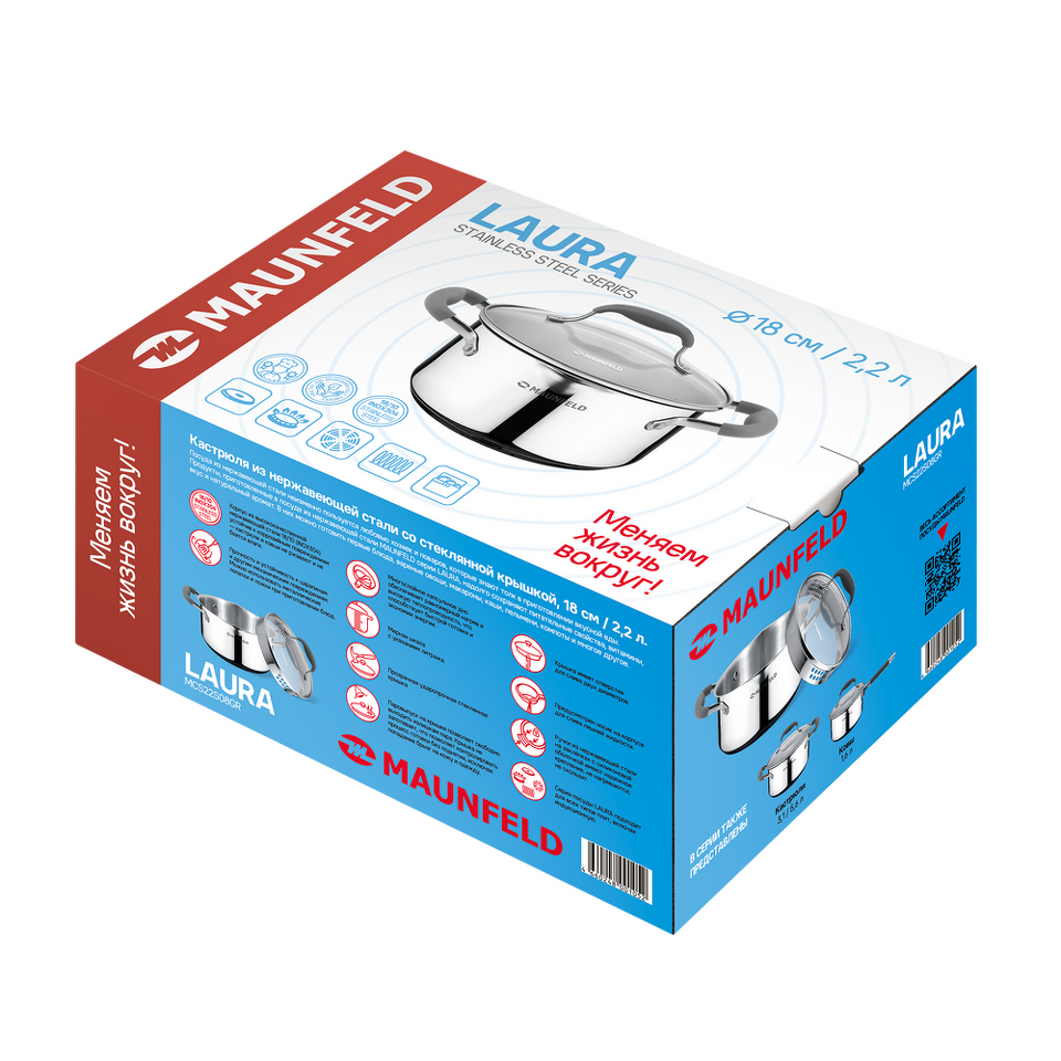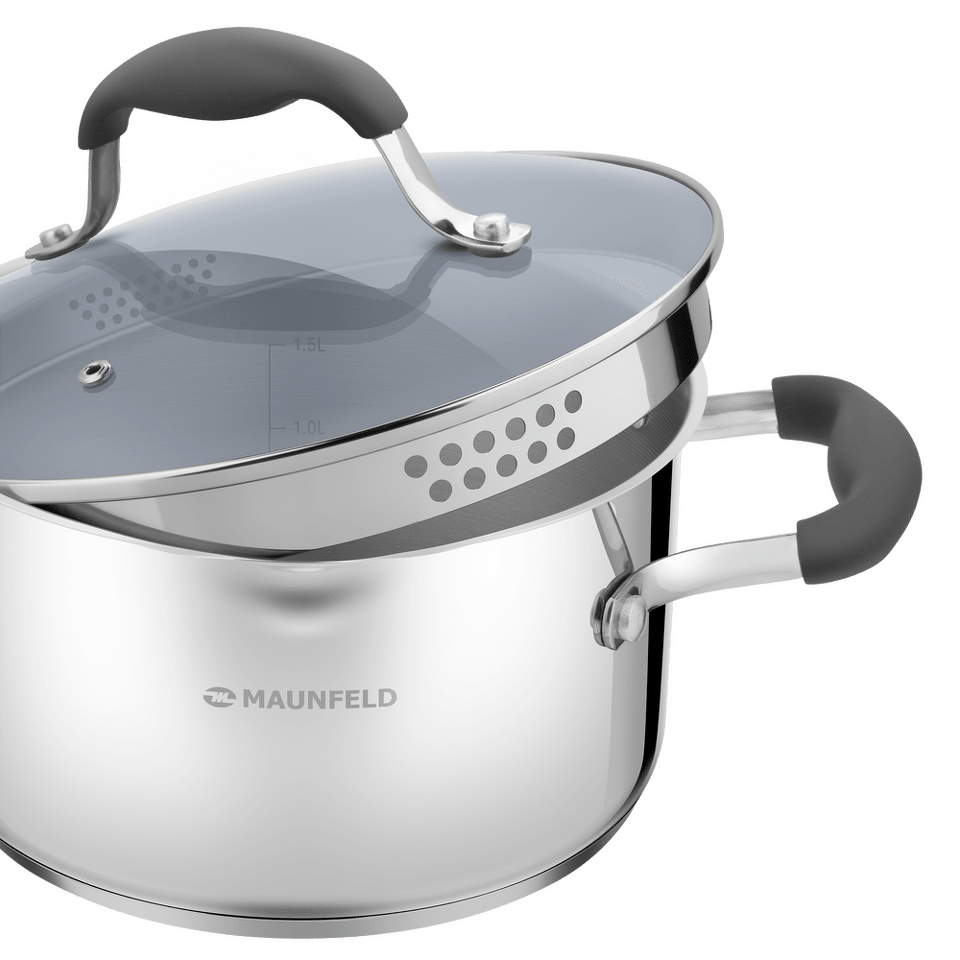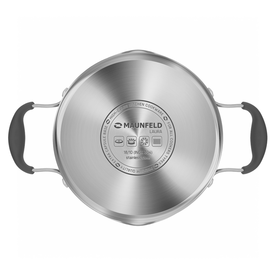 Посуда из нержавеющей стали неизменно пользуется любовью хозяек и поваров, которые знают толк в приготовлении вкусной еды. Продукты, приготовленные в посуде MAUNFELD серии LAURA из нержавеющей стали, надолго сохраняют питательные свойства, витамины, натуральный аромат и вкус приготовленных блюд. В них можно готовить первые блюда, вареные овощи, макароны, каши, пельмени, компоты и многое другое.