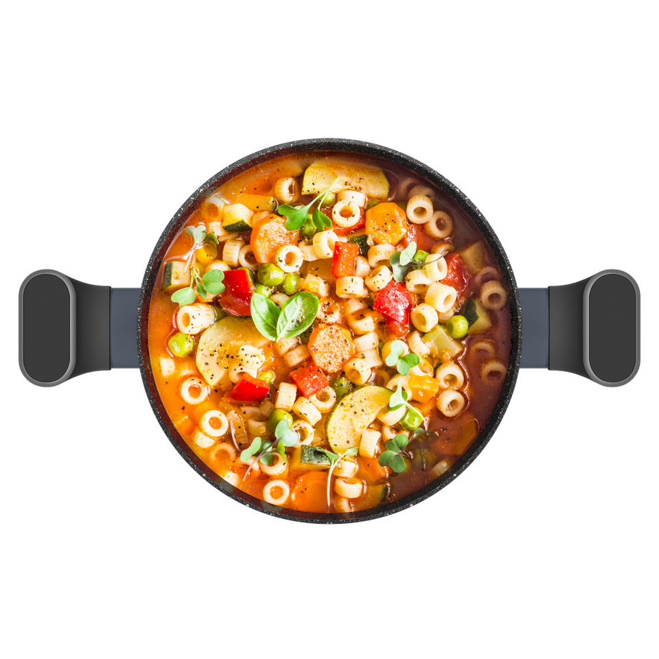 Мраморное антипригарное покрытие абсолютно инертно —это гарантирует, что в пищу не попадет никаких вредных примесей и веществ даже при воздействии очень высоких температур. Поверхность посуды не подвержена загрязнениям и не впитывает запахи.