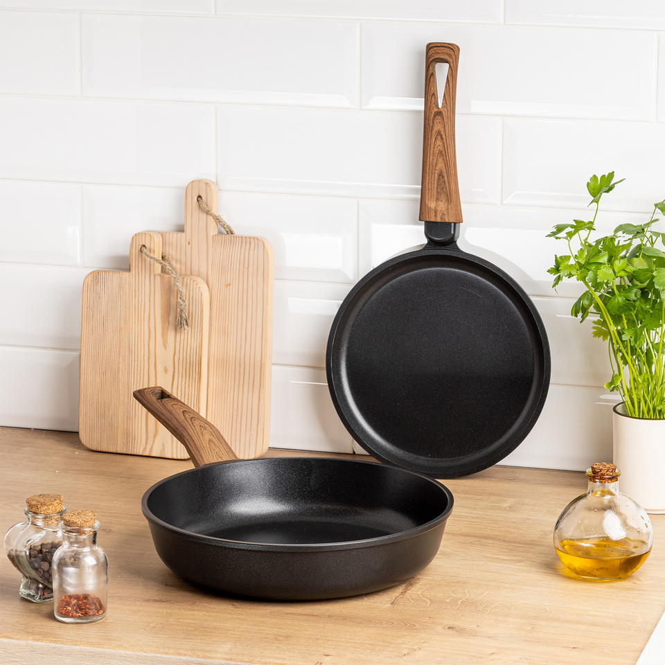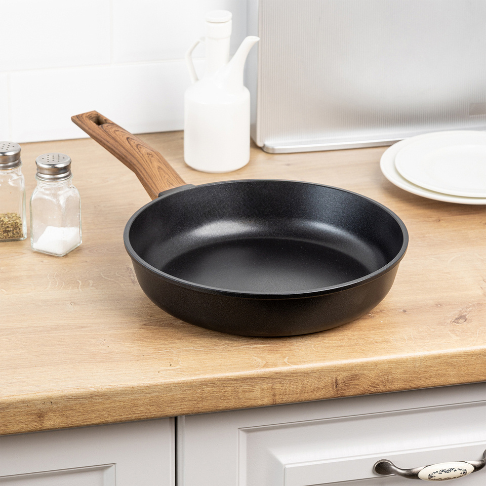 Элегантная сковорода в классическом черном цвете и ручкой из бакелита с отделкой под дерево, подойдет под любой интерьер кухни. Современные и стильные формы- мы учли все мировые тенденции, чтобы посуда была 100% экологичной и стильной.